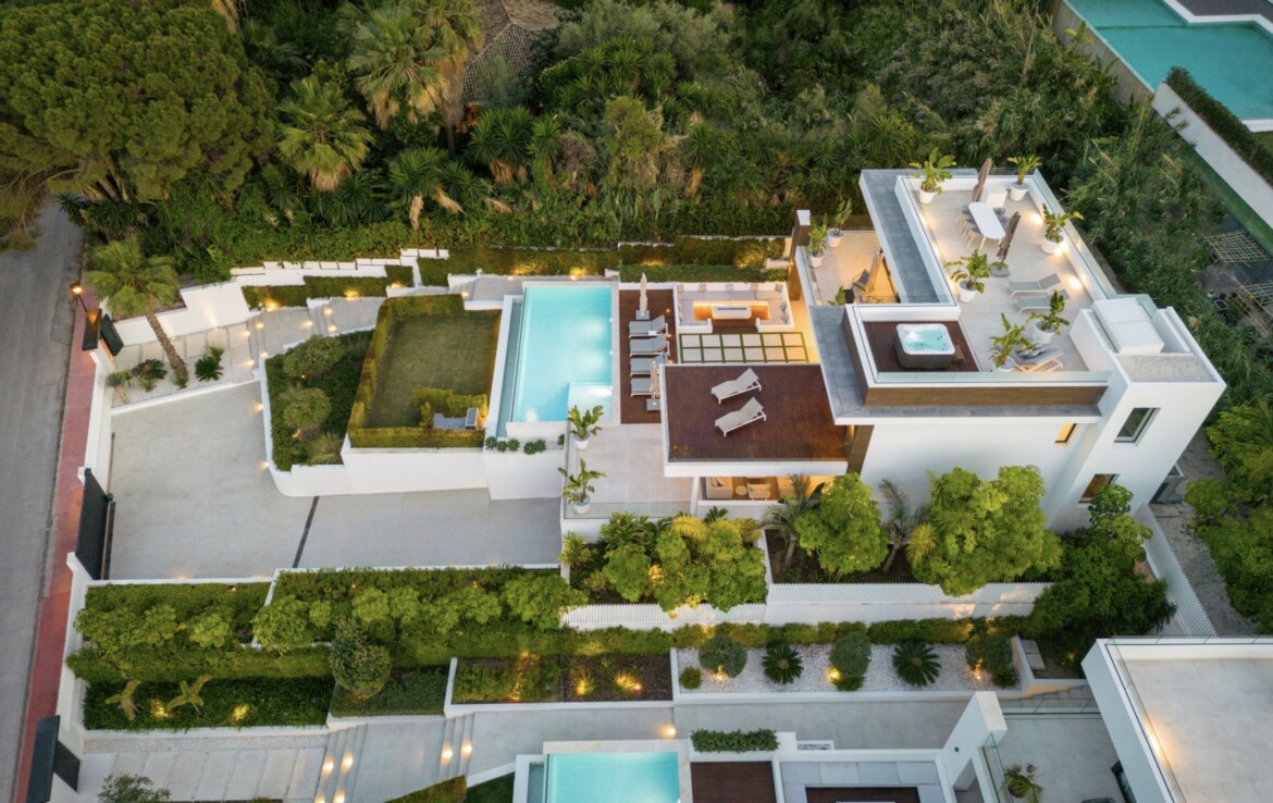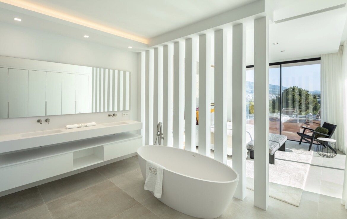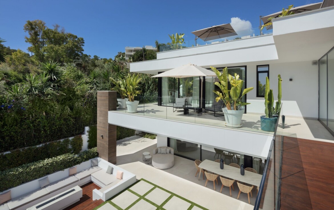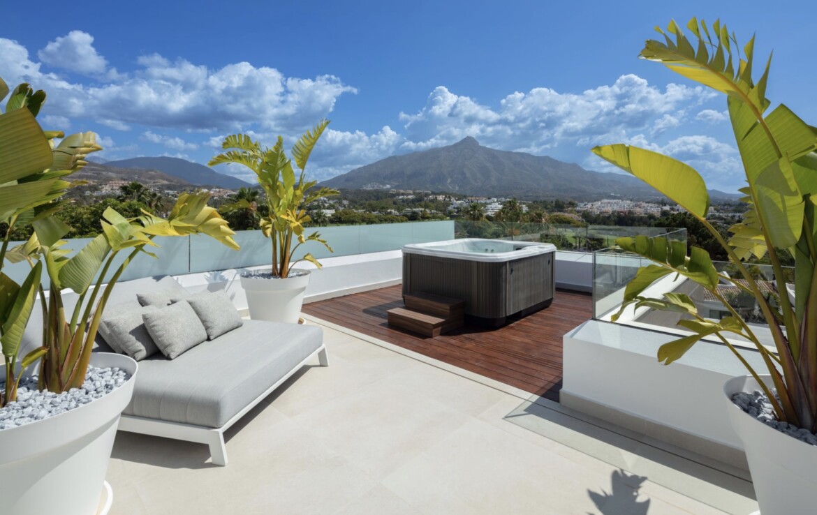 With its ideal east-facing orientation and breathtaking views of La Concha, this outstanding contemporary villa is flooded with natural light all day long. Situated in the prestigious Golf Valley of Nueva Andalucía, it offers an unparalleled blend of style, comfort, and prime location. The property’s architecture is synonymous with luxury and elegance, crafted with high-end materials that beautifully decorate the property’s exterior. Villa Camellia also boasts plenty of floor to ceiling windows and glass sliding doors, ideal for letting in an abundance of natural light. The generous exterior terraces allow for enjoying the outdoors and 320 days of sun Marbella offers its residents. The bespoke solarium equipped with a jacuzzi is perfect for indulging in the luxurious Marbella lifestyle.