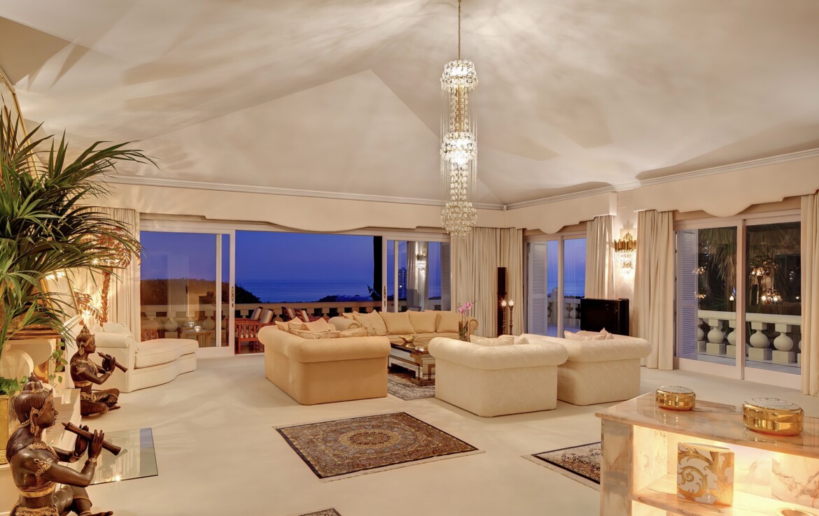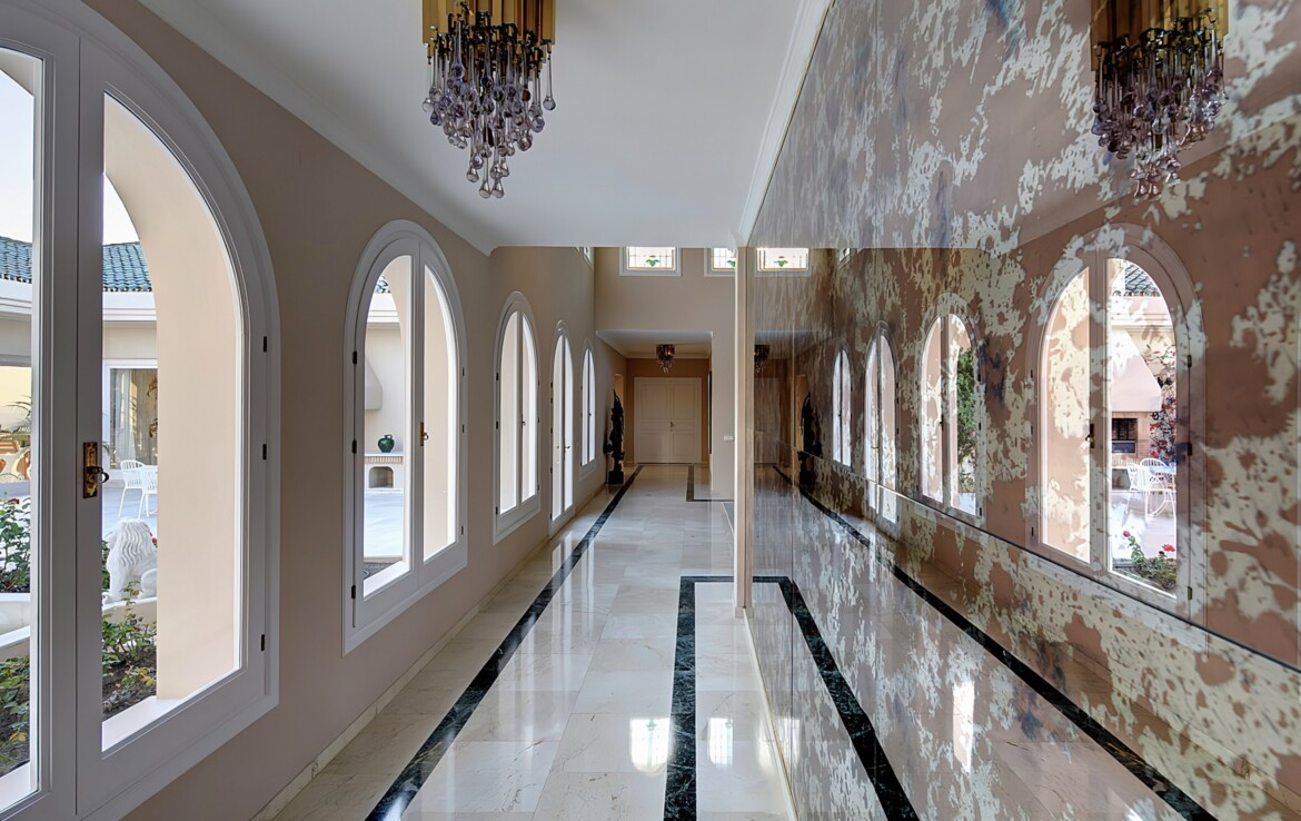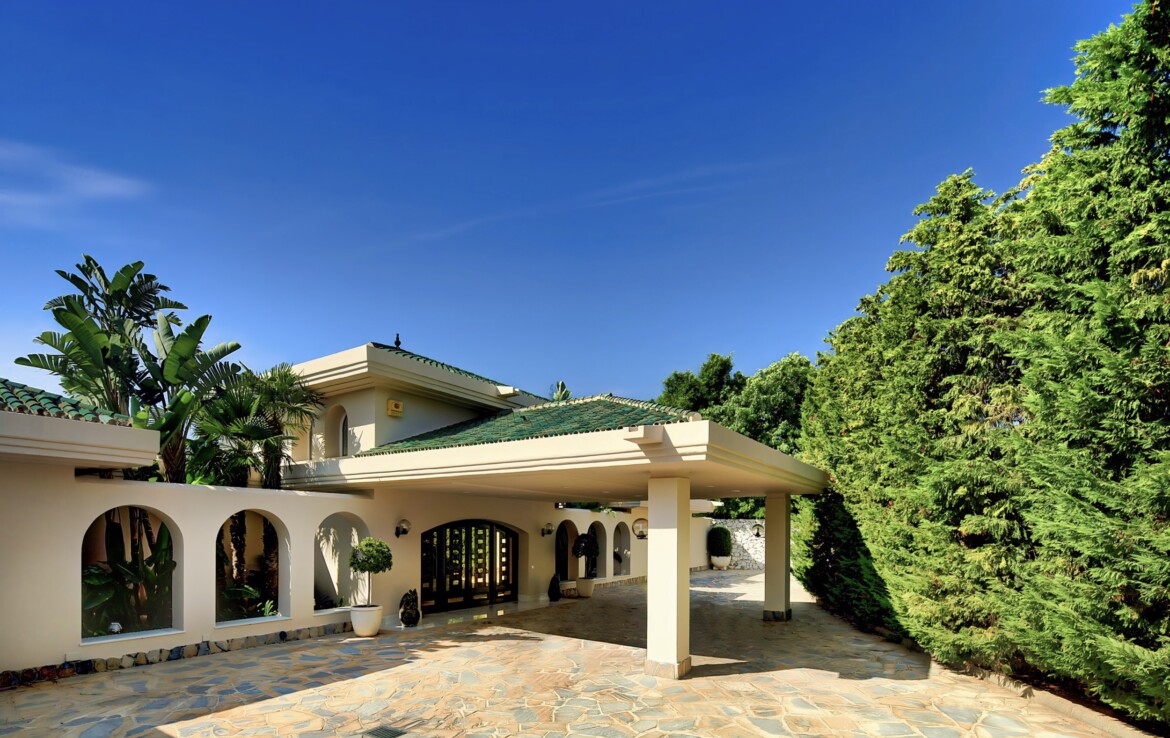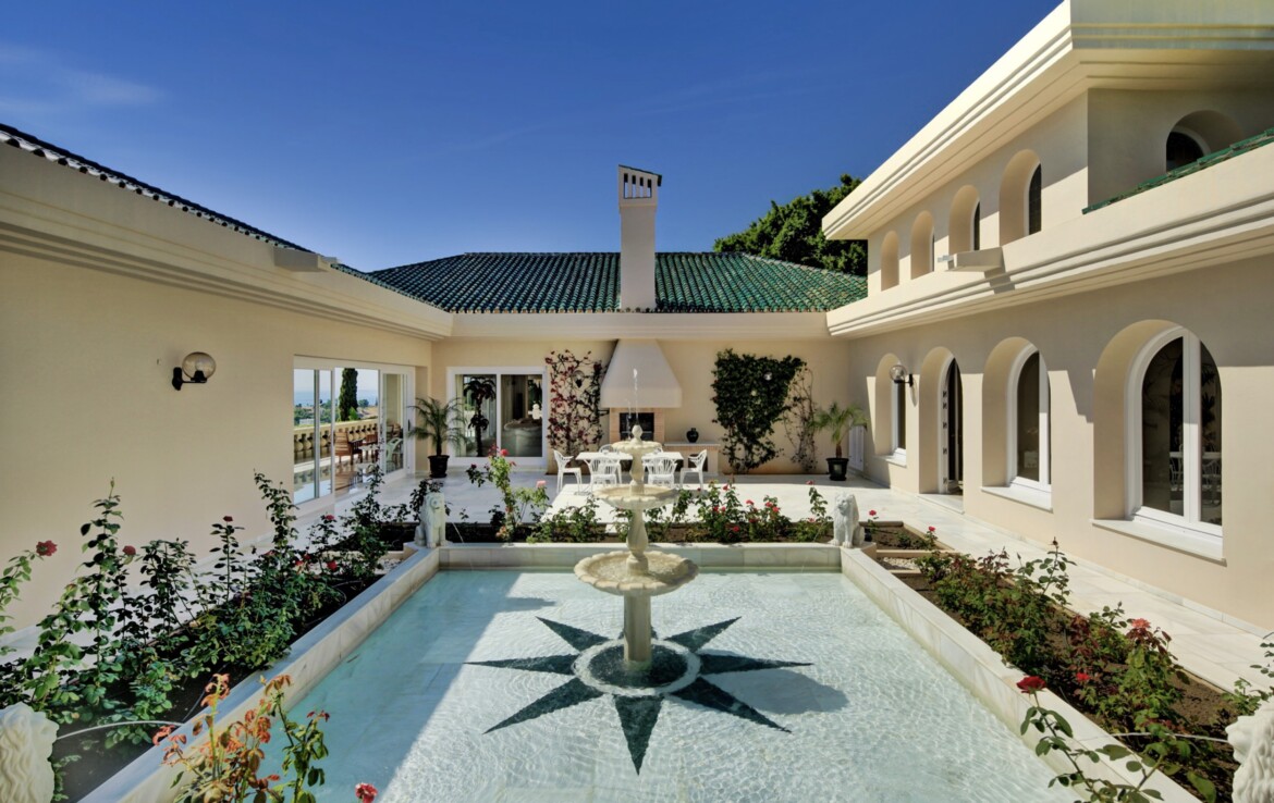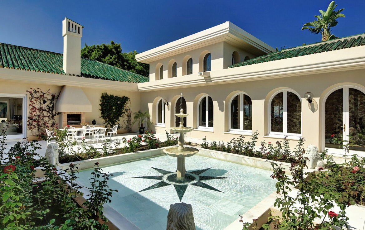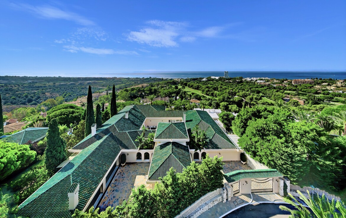 Villa Mandaluz is an extraordinary, detached villa in Río Real, Marbella East, offering a rare combination of classic Andalusian elegance and limitless potential for modern transformation. Perched atop a private hill, the property commands uninterrupted views over the Mediterranean Sea, lush golf courses, and rolling green valleys, creating a serene yet striking environment. With a vast plot of 5,775 m² and 2,600 m² of living space, this estate presents an exceptional lifestyle opportunity for discerning buyers seeking privacy, luxury, and architectural flexibility.