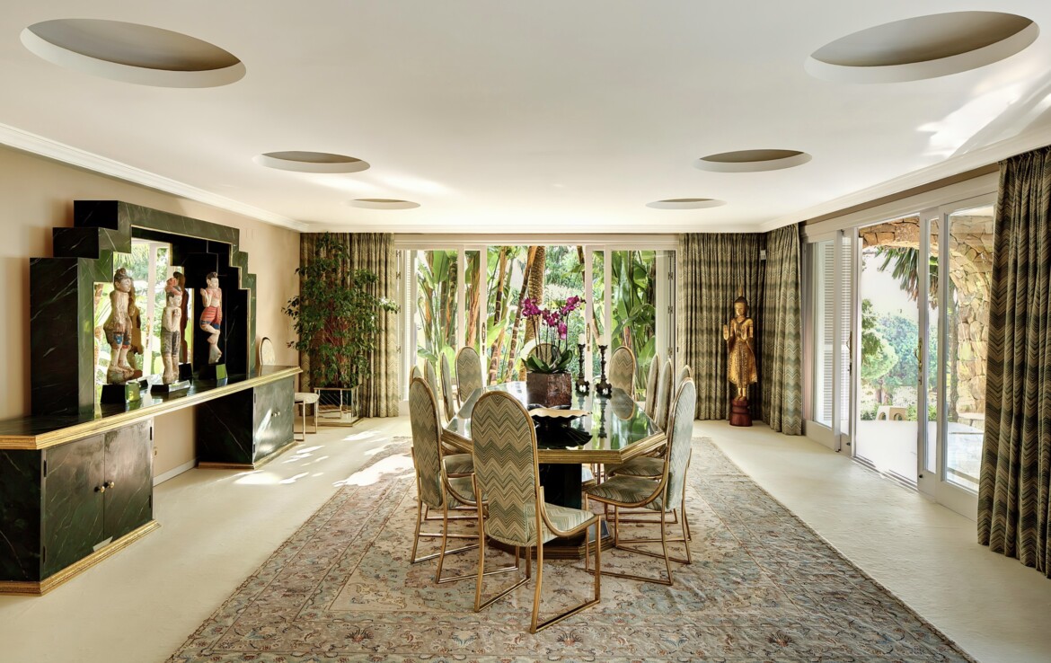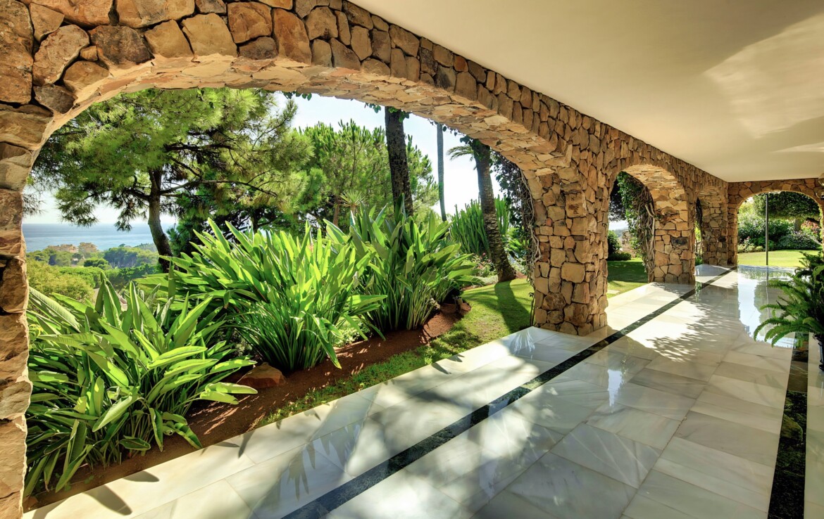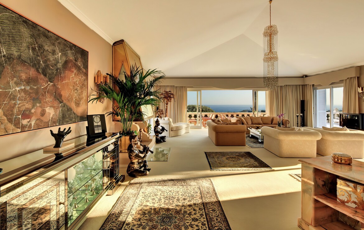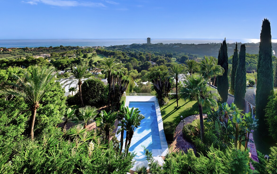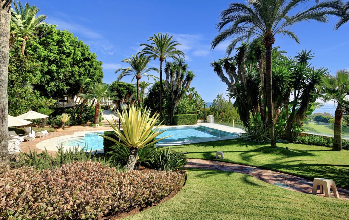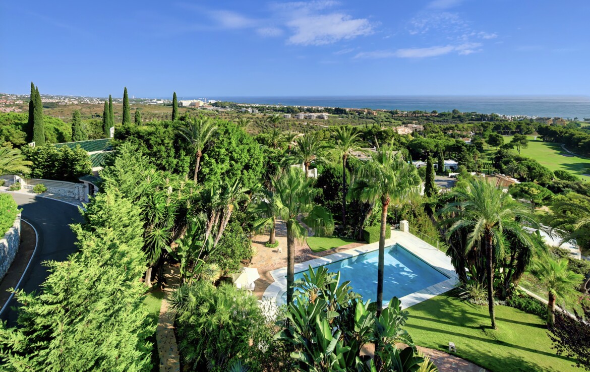 The property currently offers ten bedrooms and ten bathrooms within a timeless layout, complemented by multiple lounges, expansive terraces, and a pavilion ideal for wellness, entertaining, or a retreat-style bar. The main house features a central patio with fountain, large living and dining areas, and suites with direct access to terraces and the pool area. A separate guest house spans two floors with additional bedrooms, lounges, and kitchen facilities, providing perfect accommodation for family or visitors. The estate also includes a garage with space for four vehicles, landscaped gardens, and a massive pool area designed to maximise the spectacular sea and golf course views.