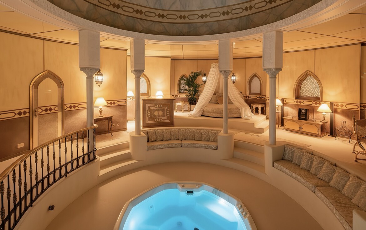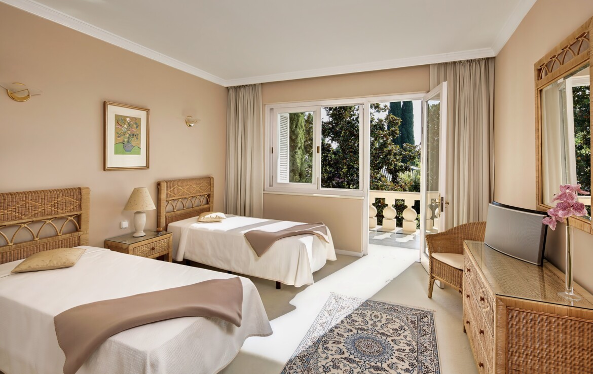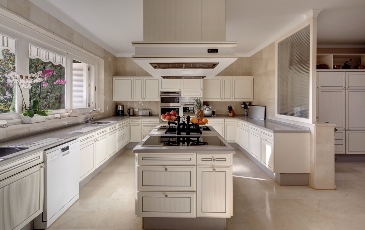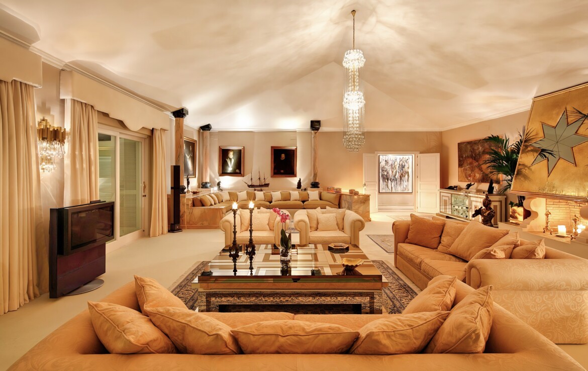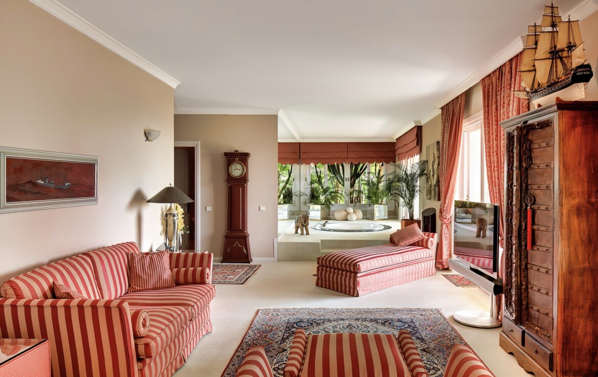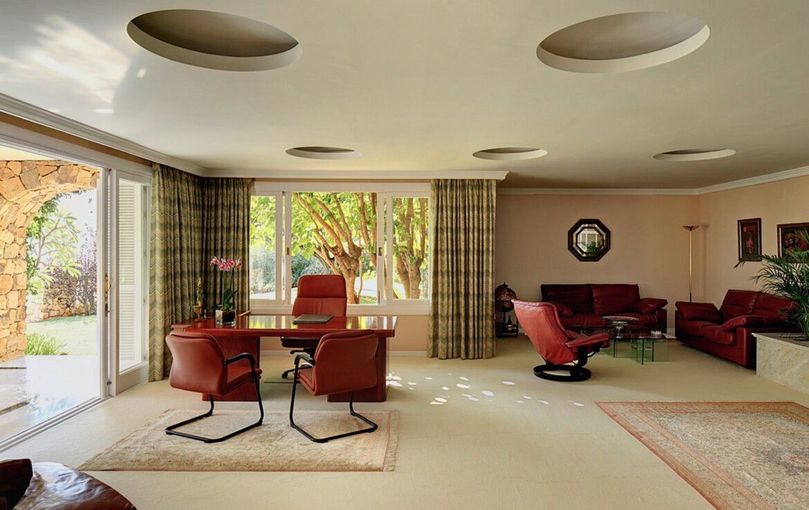 The property currently offers ten bedrooms and ten bathrooms within a timeless layout, complemented by multiple lounges, expansive terraces, and a pavilion ideal for wellness, entertaining, or a retreat-style bar. The main house features a central patio with fountain, large living and dining areas, and suites with direct access to terraces and the pool area. A separate guest house spans two floors with additional bedrooms, lounges, and kitchen facilities, providing perfect accommodation for family or visitors. The estate also includes a garage with space for four vehicles, landscaped gardens, and a massive pool area designed to maximise the spectacular sea and golf course views.