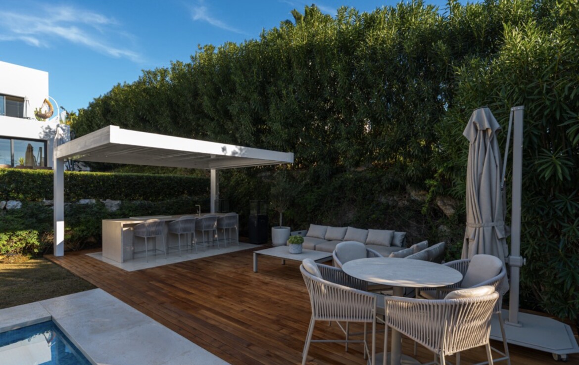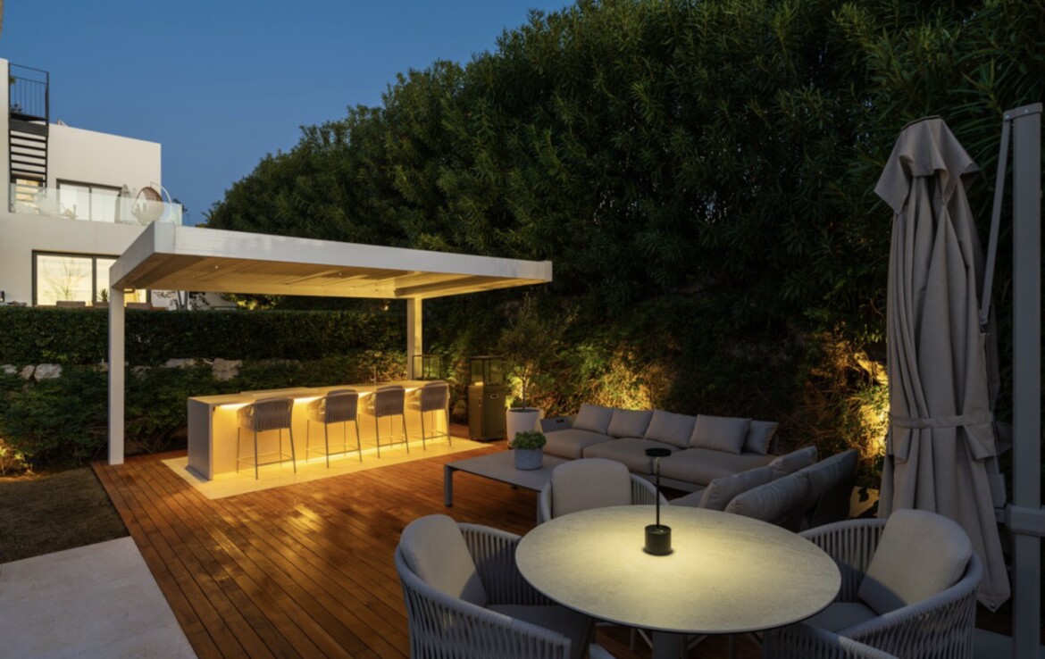 The villa features a beautifully landscaped private garden, swimming pool, multiple terraces and a panoramic rooftop solarium, creating a seamless indoor–outdoor lifestyle with all-day sun exposure and stunning sunset views. An elegant bioclimatic pergola with a fully equipped outdoor kitchenette in the garden makes alfresco dining and entertaining effortless.