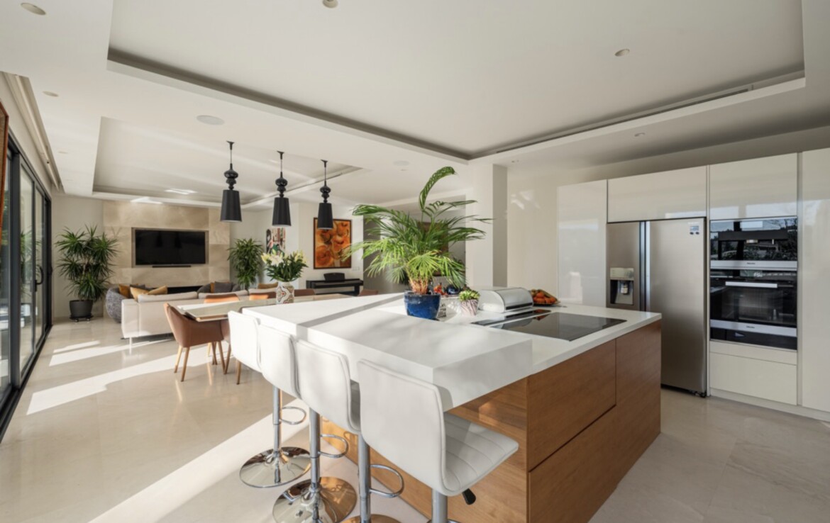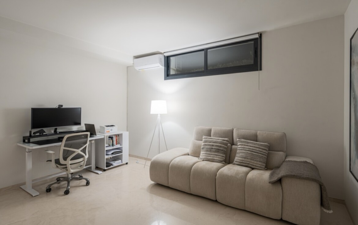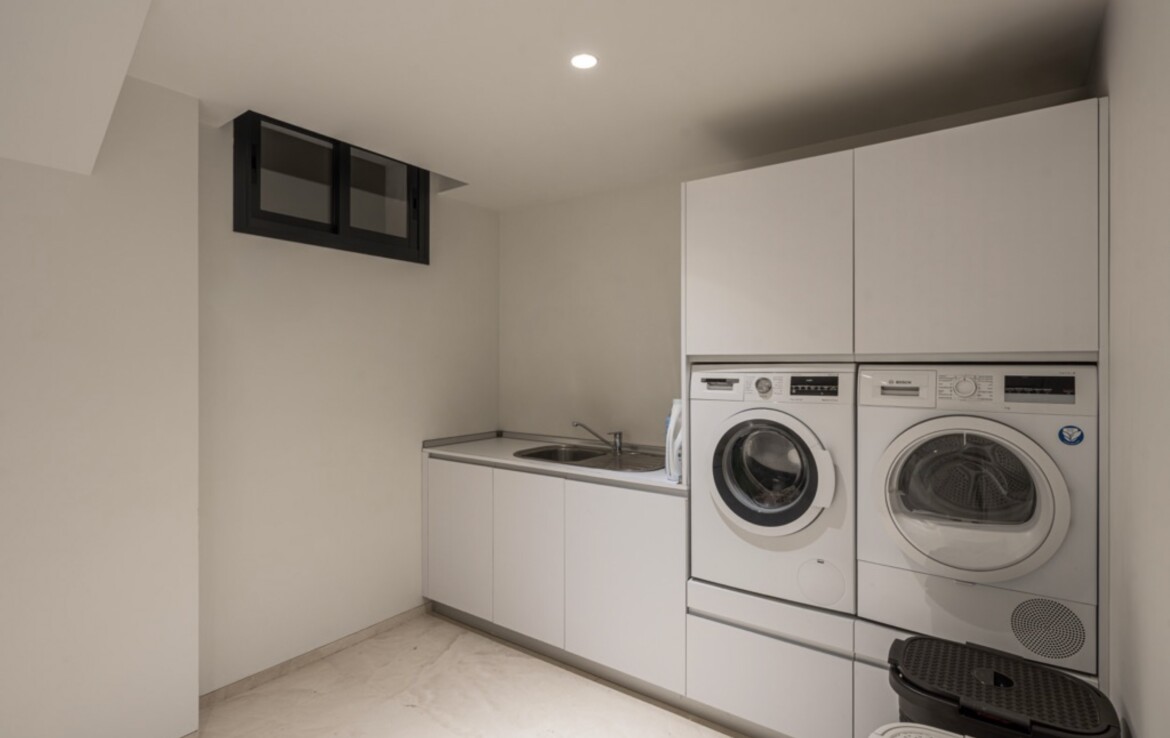 The main living areas follow a bright open-plan concept, integrating a sleek designer kitchen, dining area and spacious lounge with direct access to the terraces and garden. Floor-to-ceiling glazing floods the interiors with natural light and reinforces the connection to the outdoor spaces. A private lift connecting all floors adds both luxury and practicality, enhancing accessibility throughout the home.
