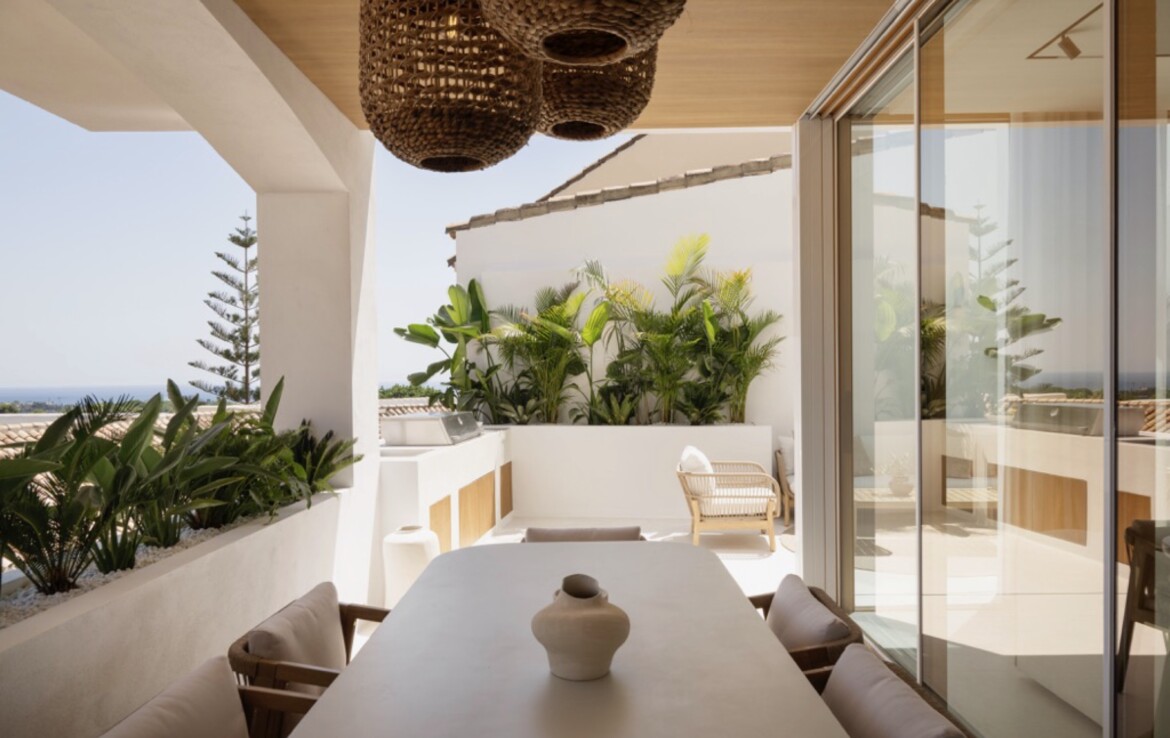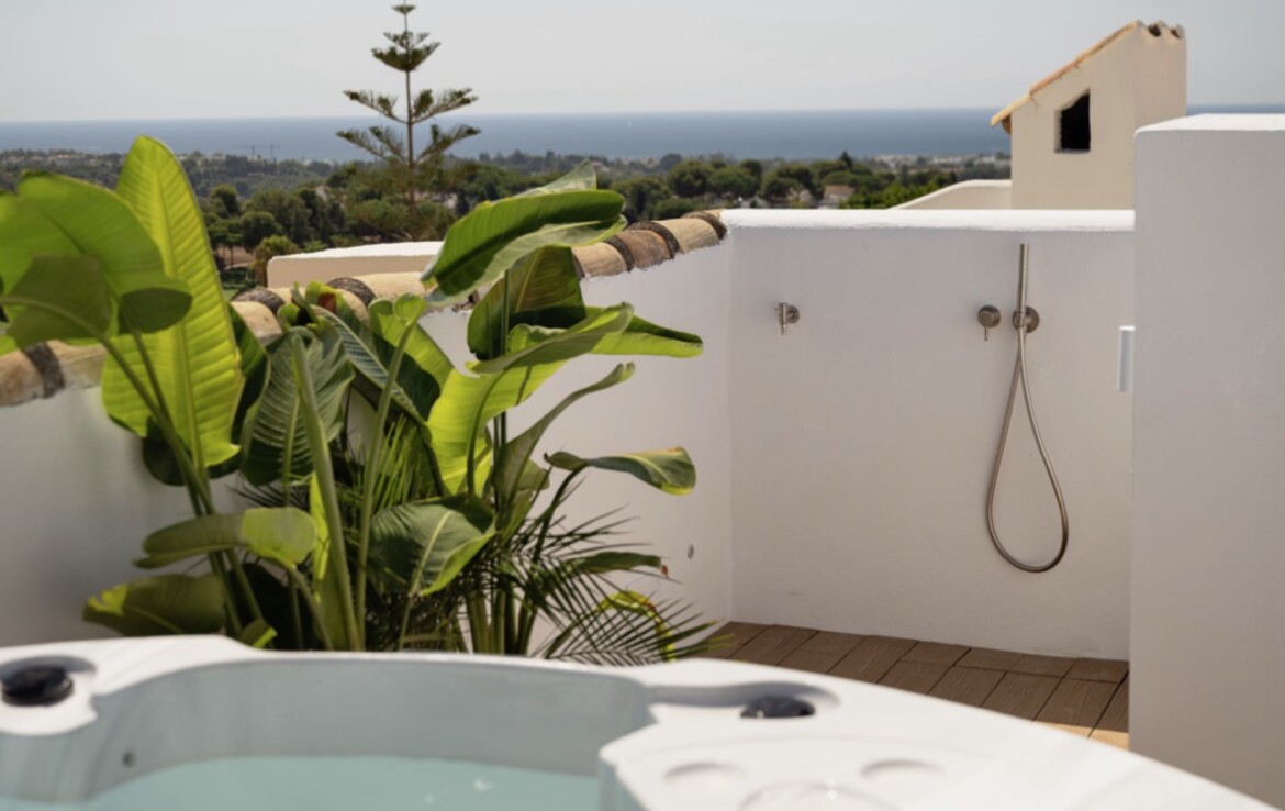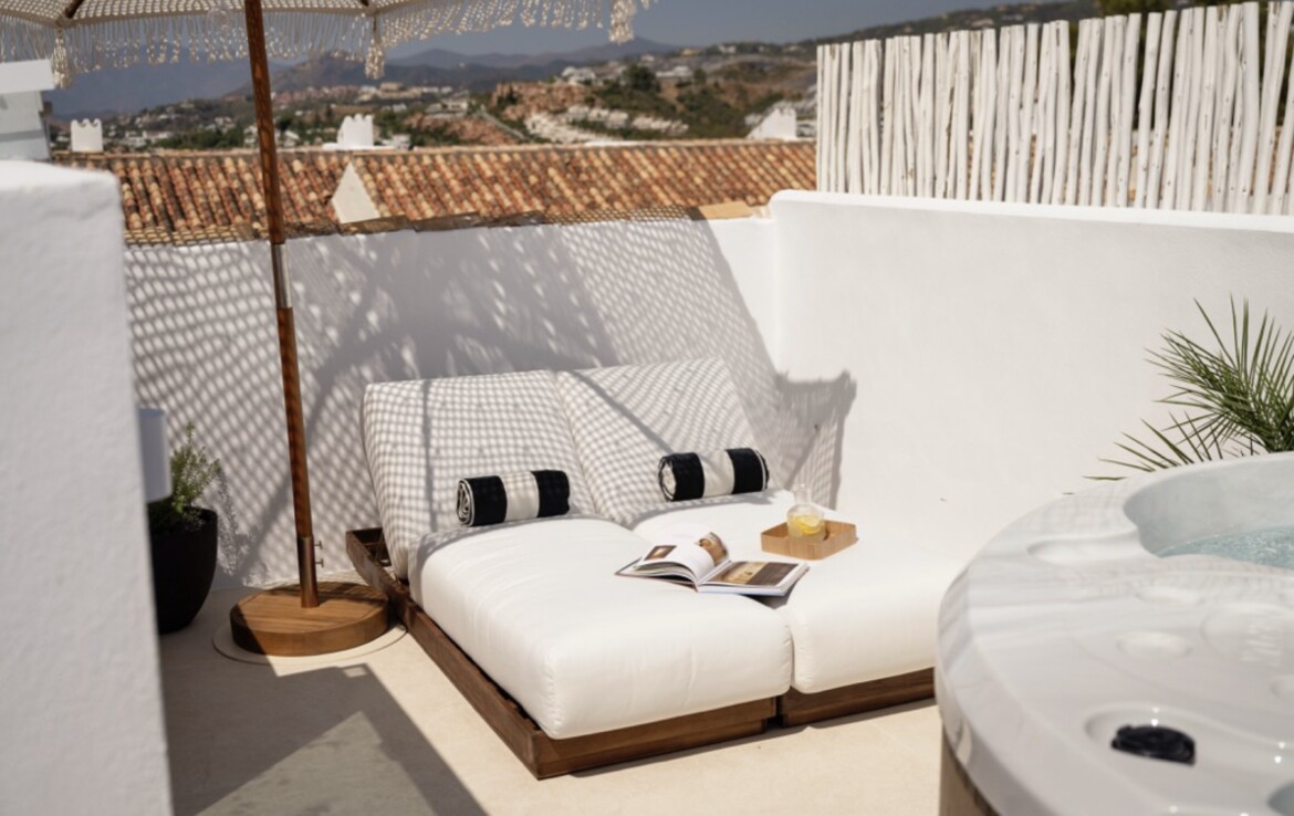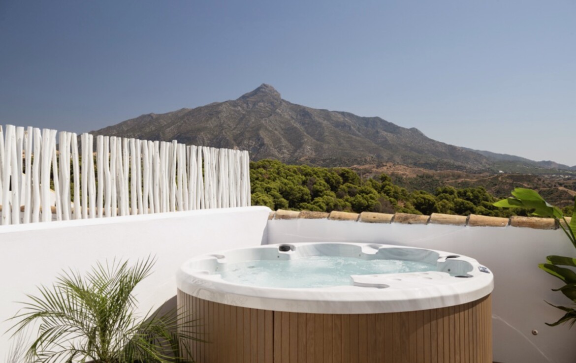 The open-plan living spaces seamlessly connect to a spacious 80 m² terrace, the perfect setting for gatherings, al fresco dining, or simply enjoying the stunning views of La Concha Mountain. A private jacuzzi adds a touch of indulgence, inviting you to relax in total serenity.