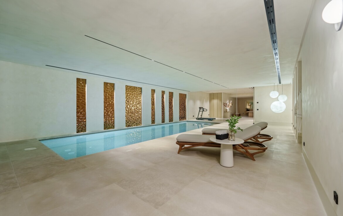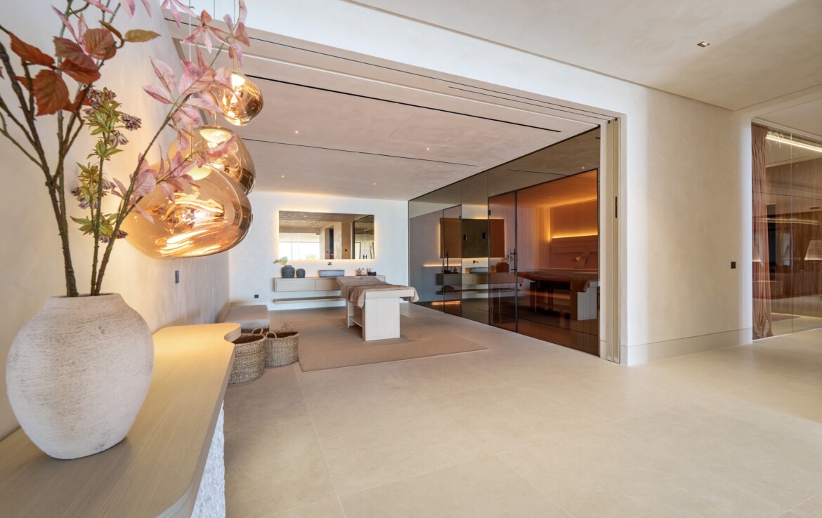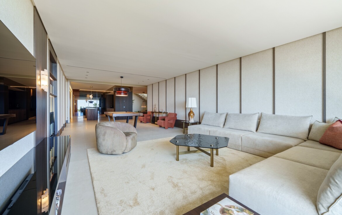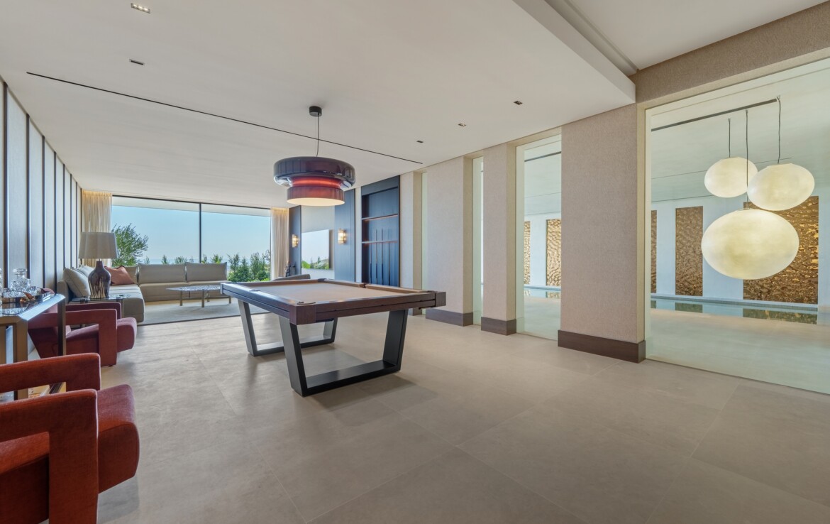 La planta baja ofrece casi 800 m² de espacio suntuoso, diseñado para aprovechar al máximo la luz natural y las vistas a través de sus amplios ventanales. Aquí encontrará varias salas de estar para relajarse o recibir invitados, una sala de juegos, una sala de cine, un gimnasio totalmente equipado y un spa interior con piscina y jacuzzi.