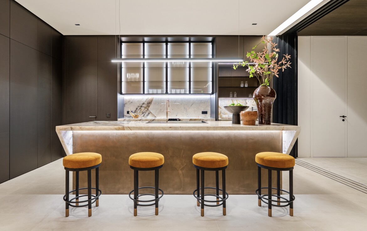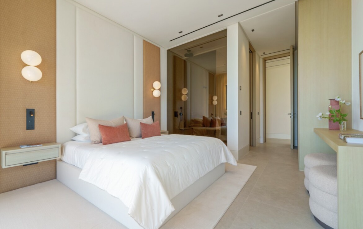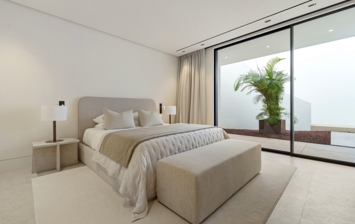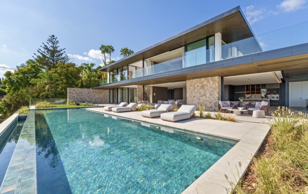 En el interior, la luz del sol inunda el vestíbulo a través de grandes ventanales que van del suelo al techo, enmarcando vistas espectaculares. La sala de estar principal cuenta con un elegante salón con chimenea que lo separa con distinción del amplio comedor y la cocina contemporánea. Una cocina exterior contigua complementa la experiencia culinaria, ideal para recibir invitados. En esta planta también encontrará dos habitaciones de invitados, cada una con su propio baño privado.