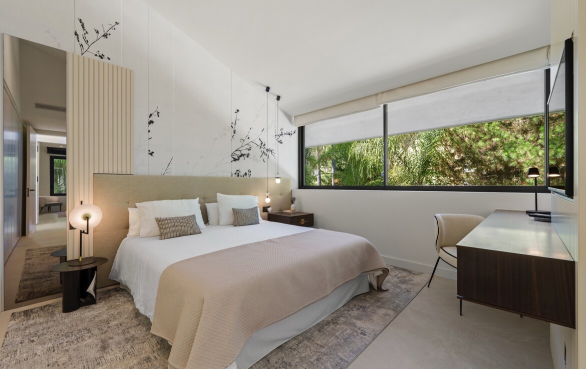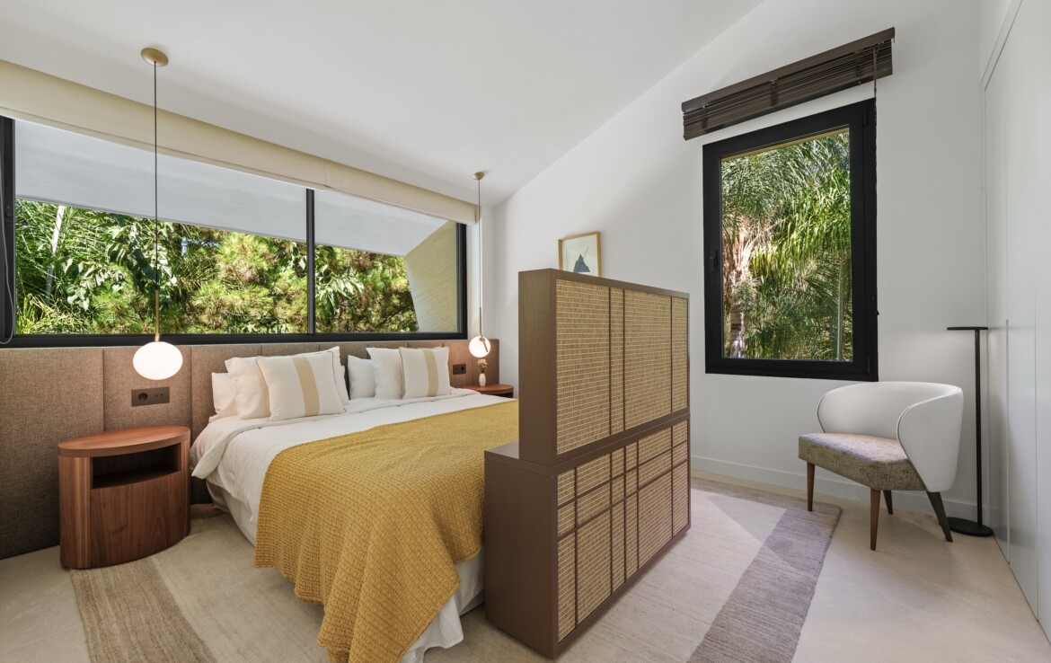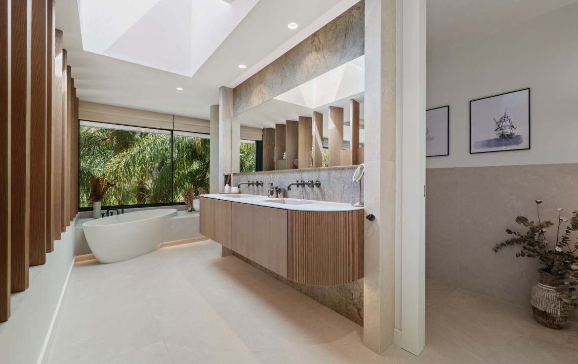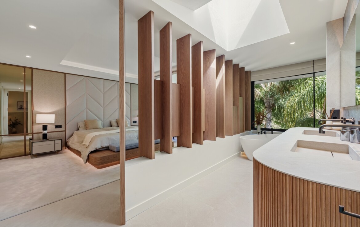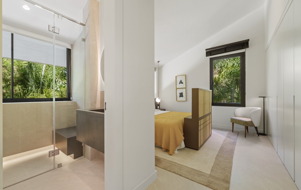 La villa incluye habitaciones de invitados bien diseñadas y una espaciosa suite principal, todas ellas con vistas a la vegetación y abundante luz natural. La suite principal cuenta con un amplio baño privado con bañera exenta y lavabo doble, separado por detalles arquitectónicos de madera que aportan privacidad sin perder la sensación de amplitud. Las habitaciones se complementan con acabados modernos y grandes ventanales que realzan la conexión con los jardines.