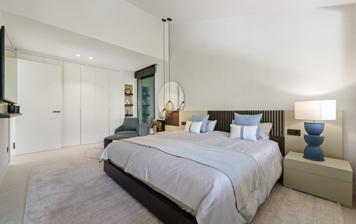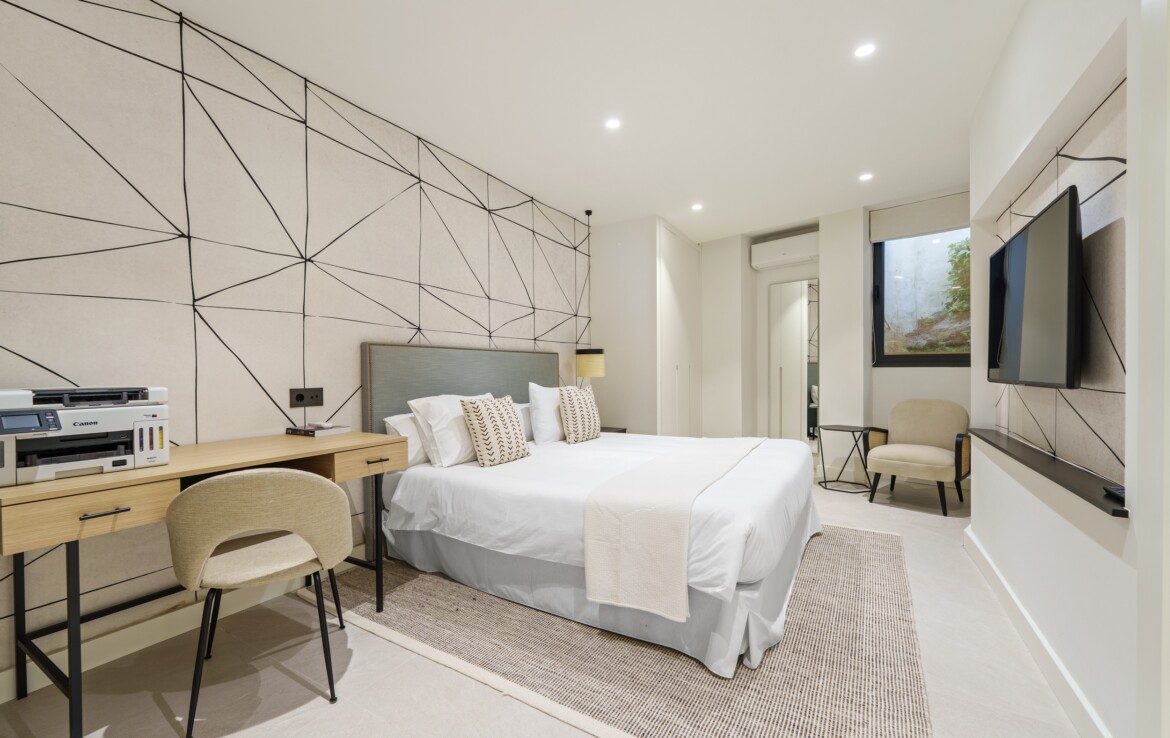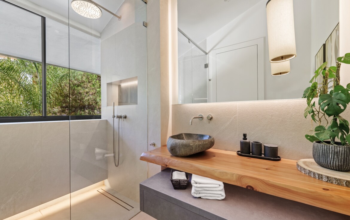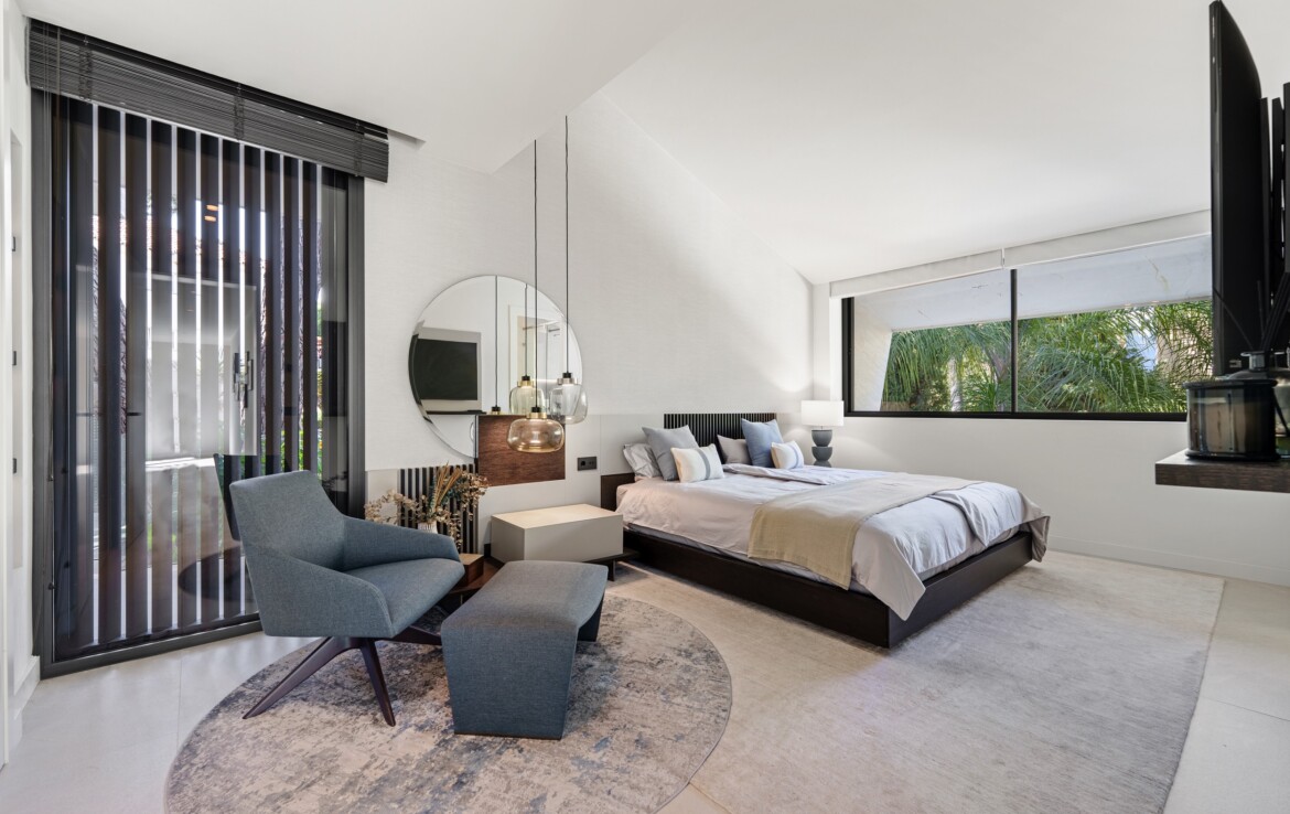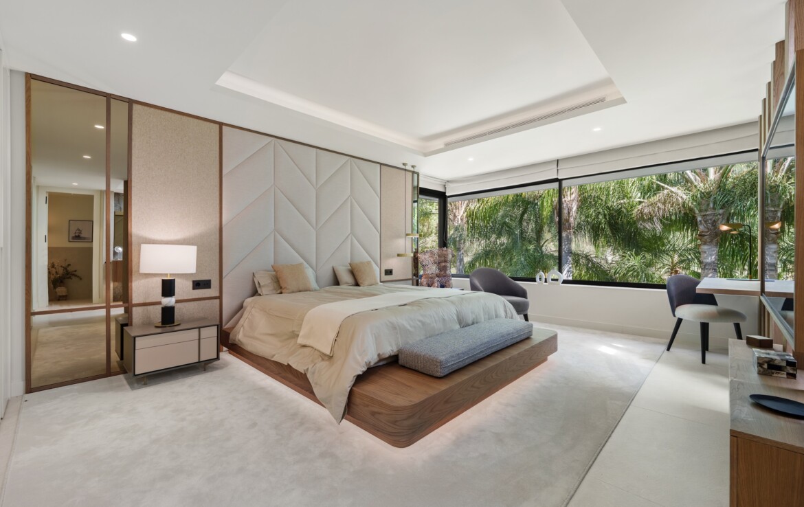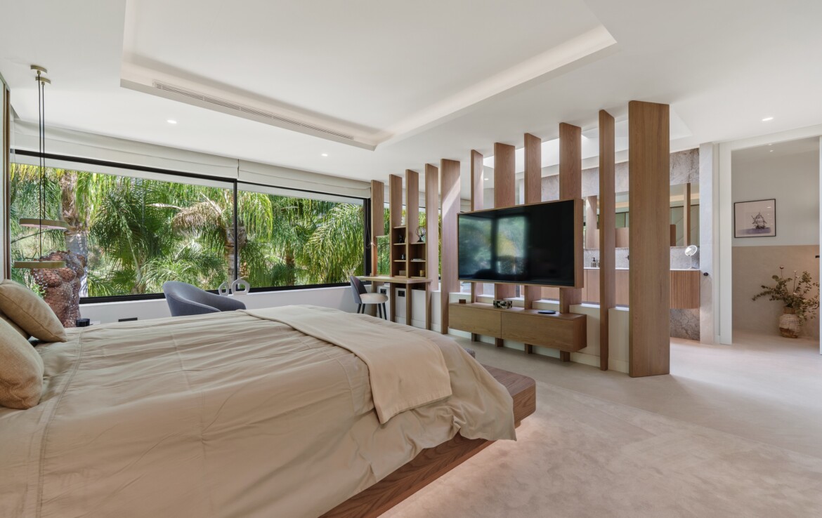 La villa incluye habitaciones de invitados bien diseñadas y una espaciosa suite principal, todas ellas con vistas a la vegetación y abundante luz natural. La suite principal cuenta con un amplio baño privado con bañera exenta y lavabo doble, separado por detalles arquitectónicos de madera que aportan privacidad sin perder la sensación de amplitud. Las habitaciones se complementan con acabados modernos y grandes ventanales que realzan la conexión con los jardines.