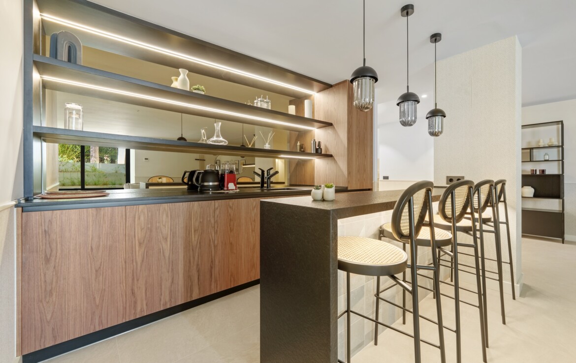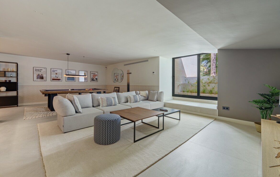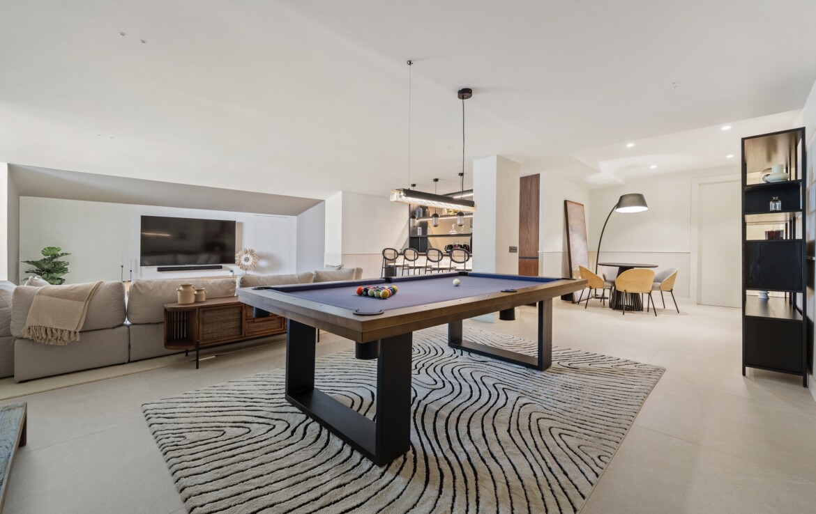 En la planta semisótano, una sala de entretenimiento ofrece un espacio confortable para reuniones. Dispone de zona de estar, bar y mesa de billar, ideal para relajarse o disfrutar de veladas con amigos. Este nivel adicional garantiza que la villa mantenga un concepto de vivienda en una sola planta, a la vez que ofrece la ventaja de contar con zonas de ocio independientes.