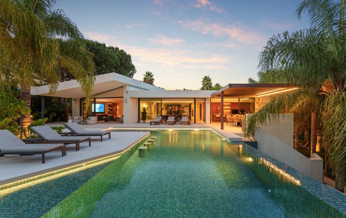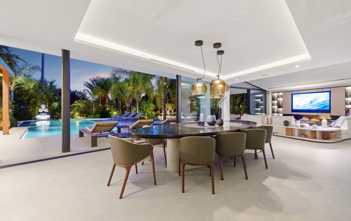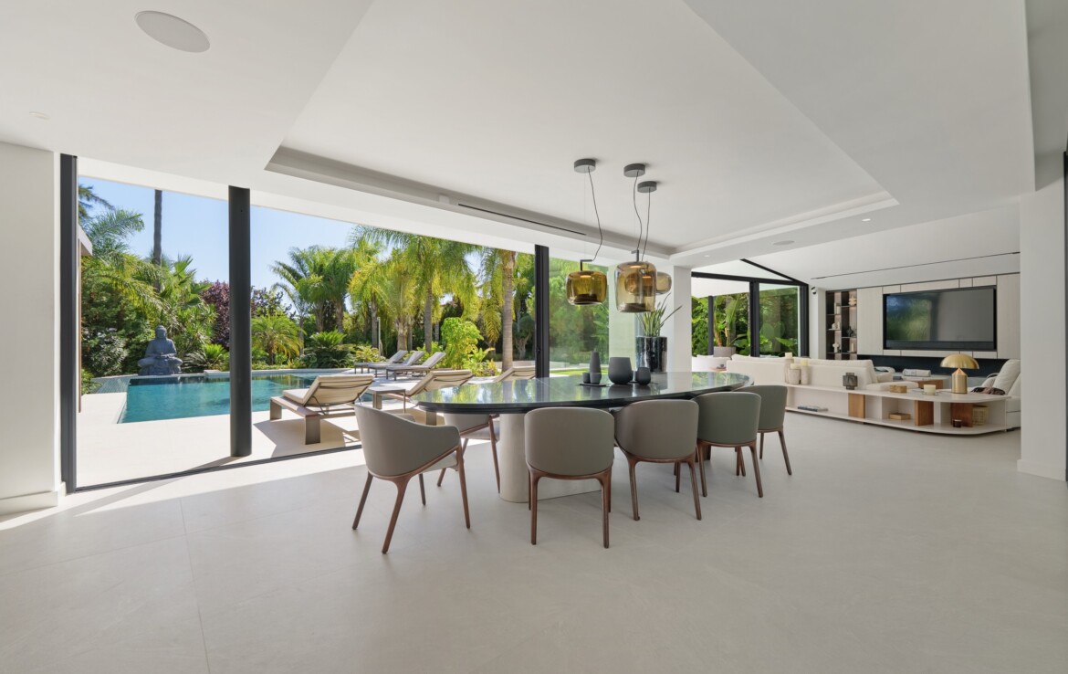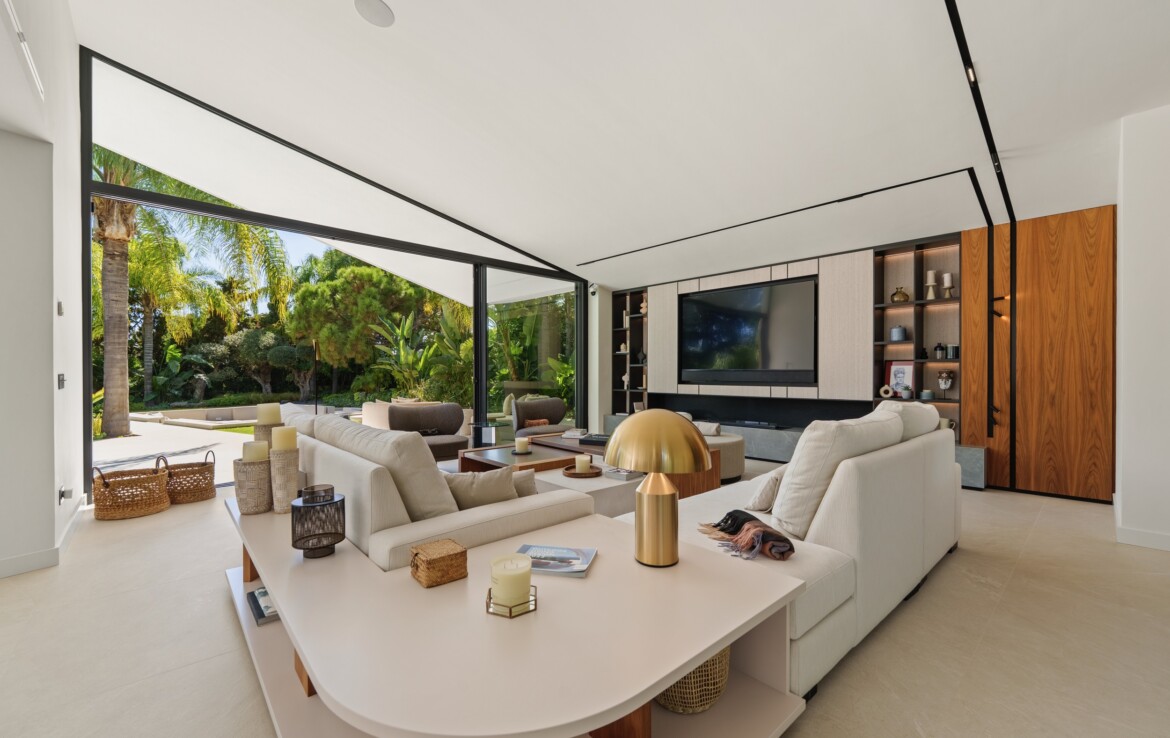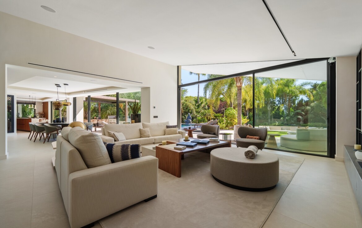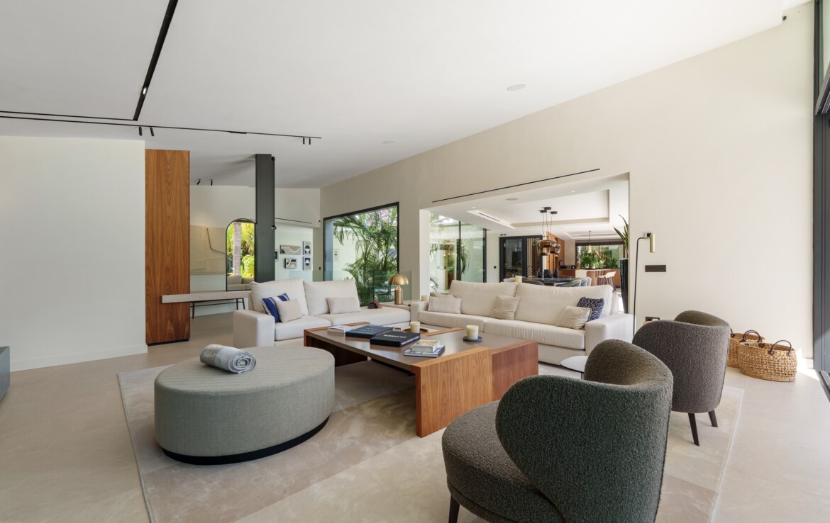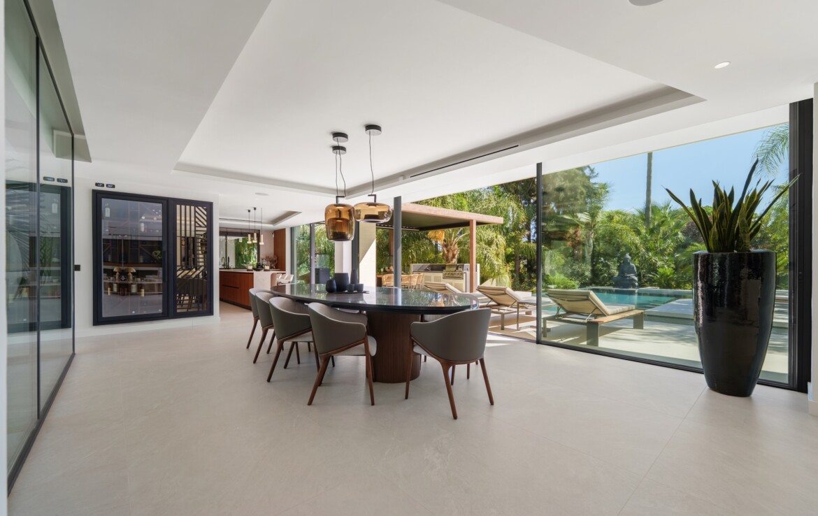 Las Chapas 5 es una villa contemporánea ubicada en Las Chapas, Marbella Este, diseñada en una sola planta con una planta semisótano para el ocio y el entretenimiento. Su distribución se centra en espacios abiertos, con amplias puertas correderas de cristal que conectan el interior con las zonas exteriores. El espacio principal integra salón, comedor y cocina, con acabados de líneas puras, cálidos detalles en madera y vistas al jardín y la piscina.