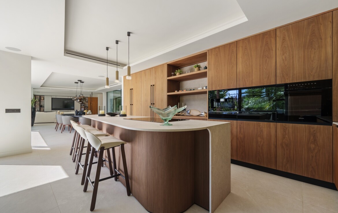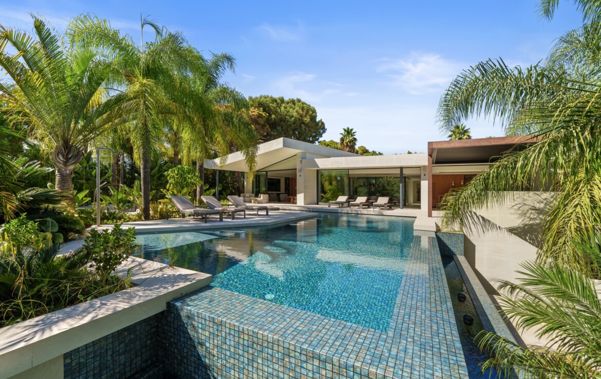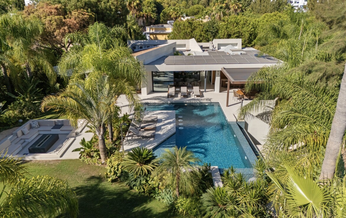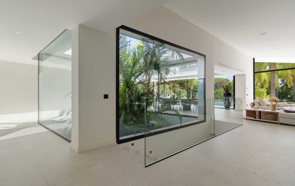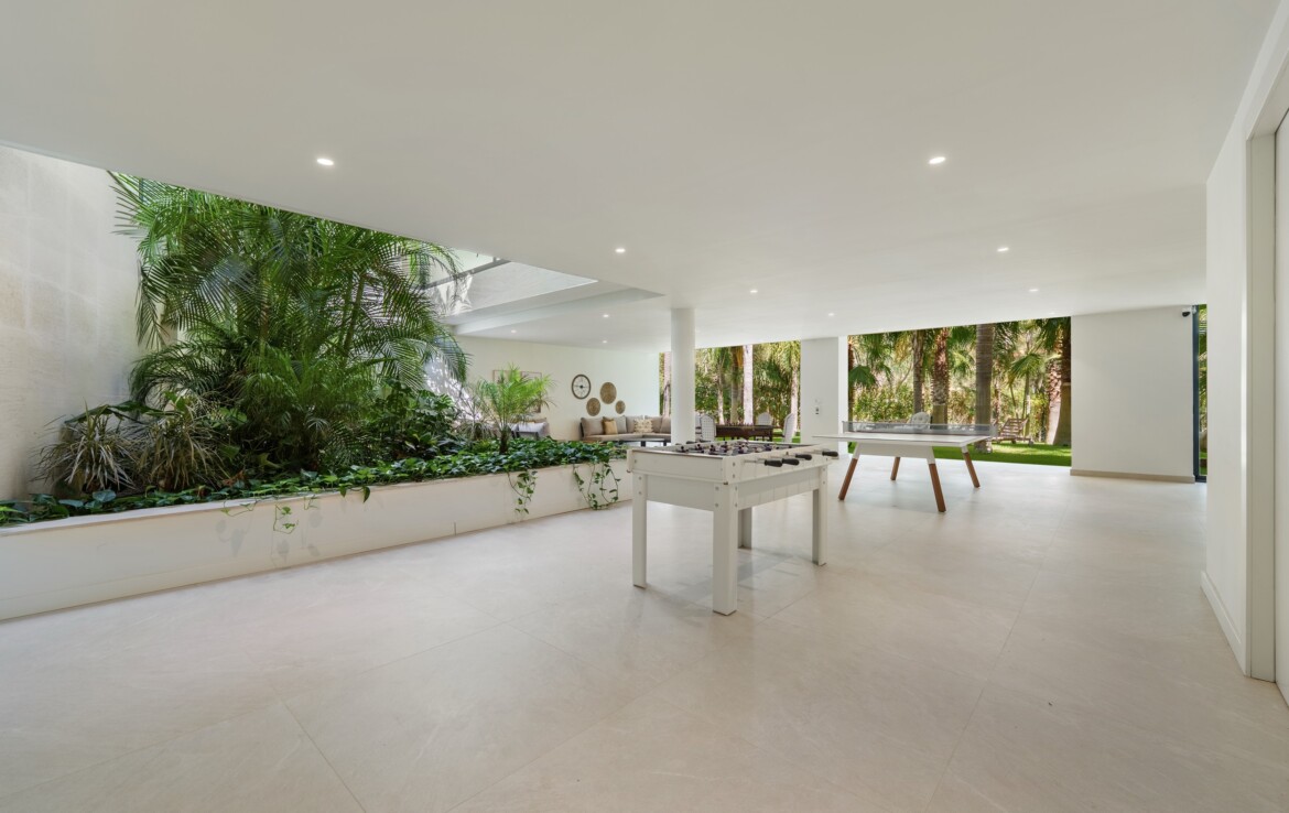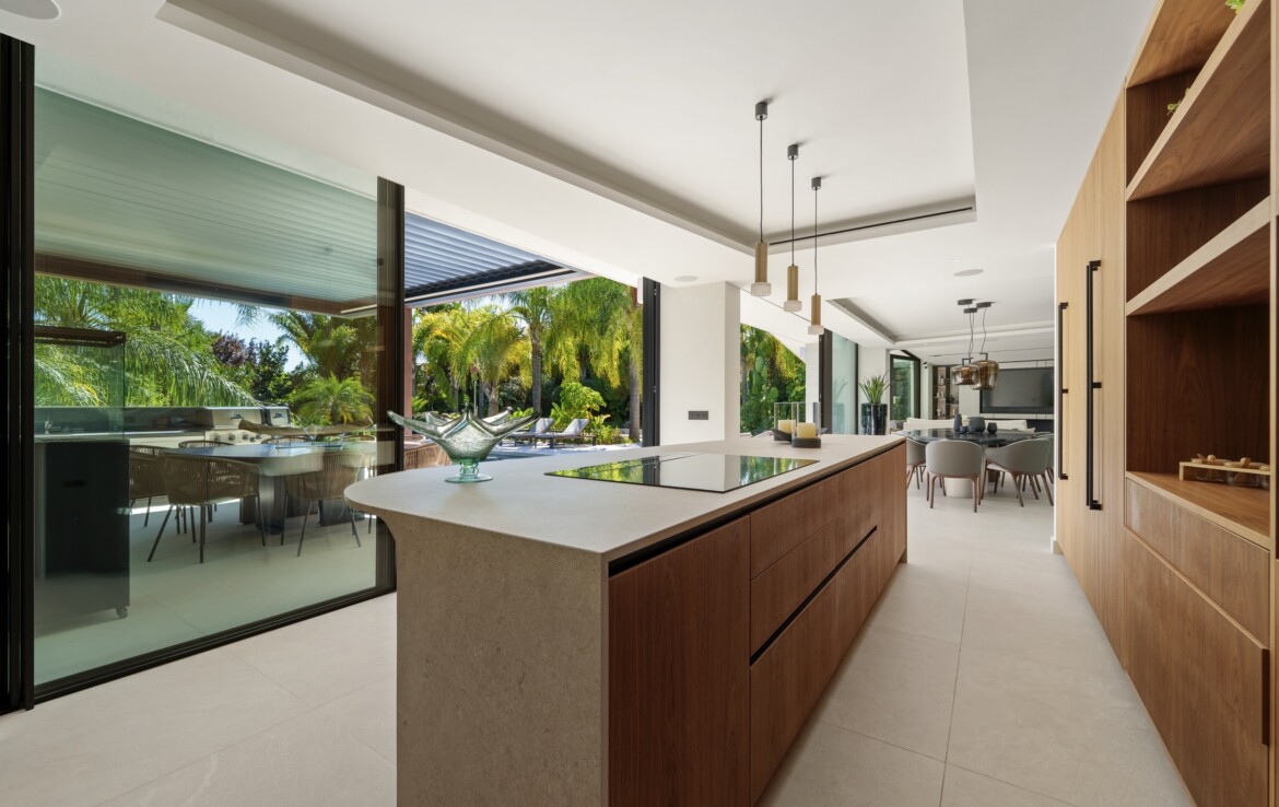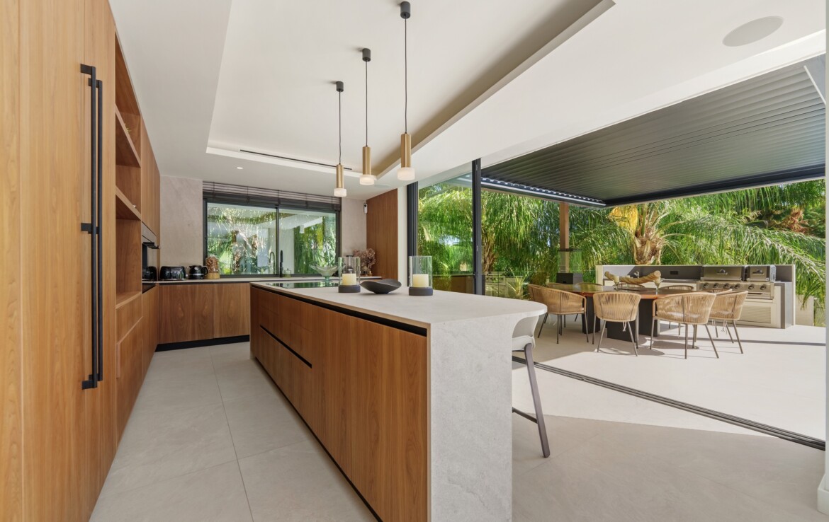 Las Chapas 5 es una villa contemporánea ubicada en Las Chapas, Marbella Este, diseñada en una sola planta con una planta semisótano para el ocio y el entretenimiento. Su distribución se centra en espacios abiertos, con amplias puertas correderas de cristal que conectan el interior con las zonas exteriores. El espacio principal integra salón, comedor y cocina, con acabados de líneas puras, cálidos detalles en madera y vistas al jardín y la piscina.