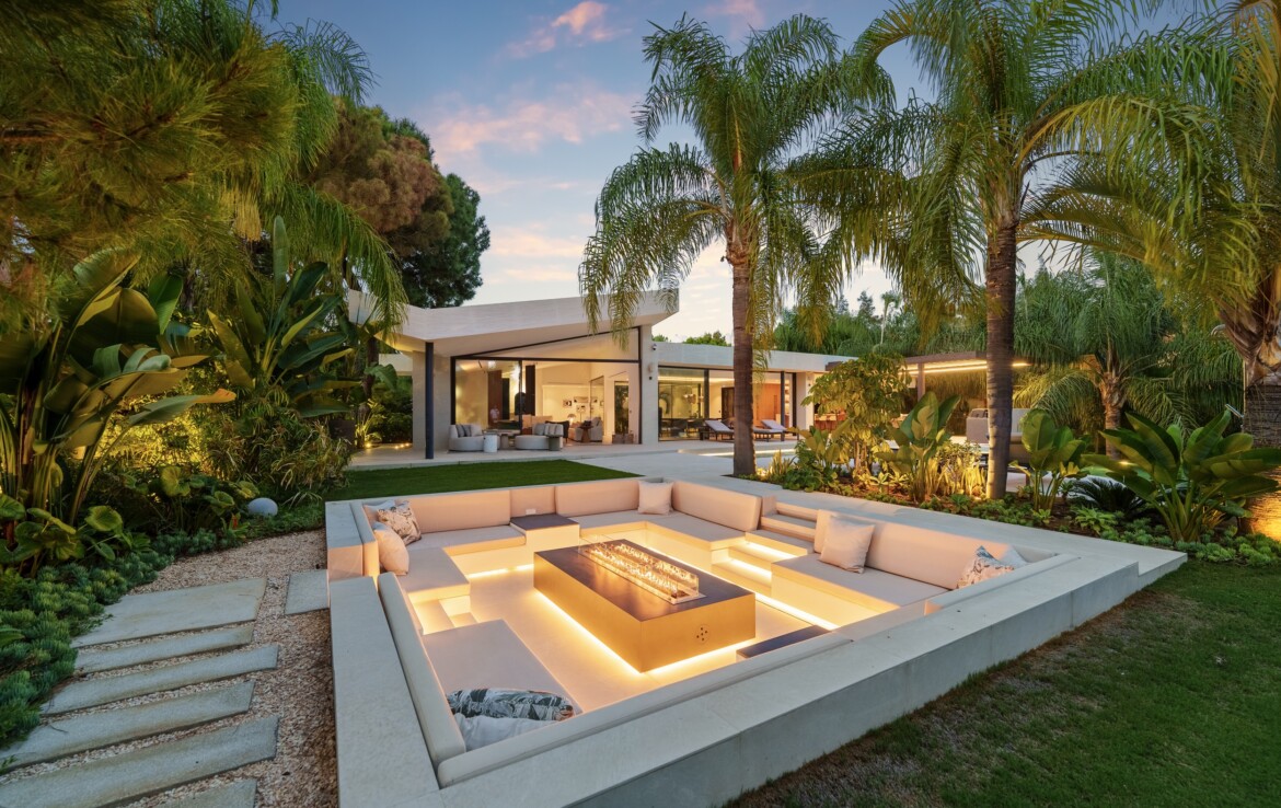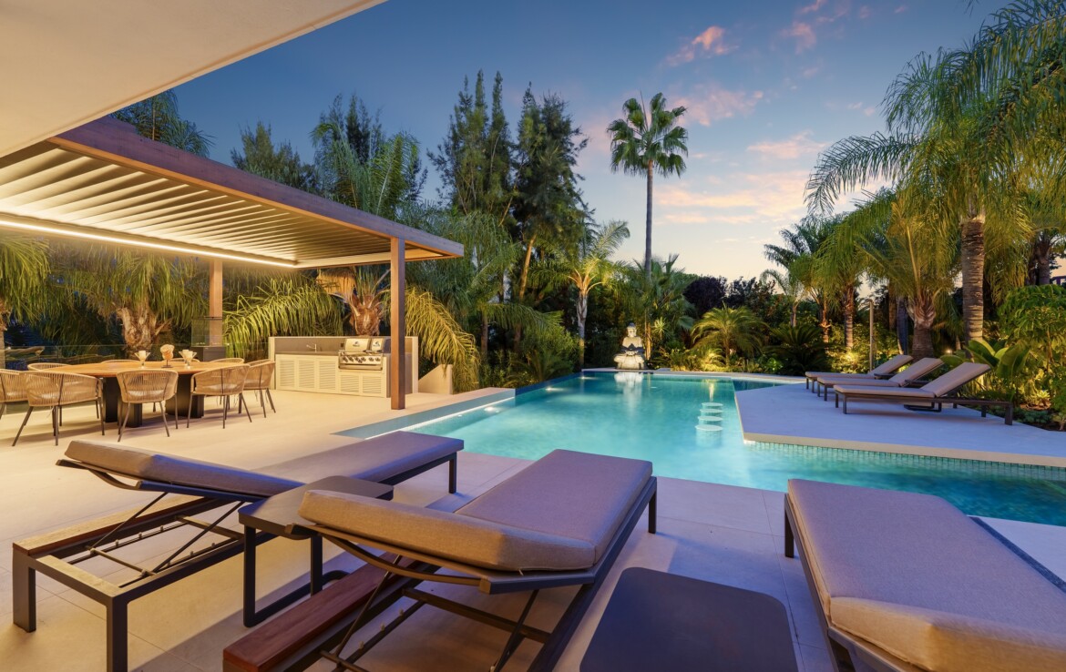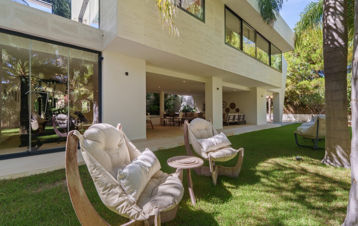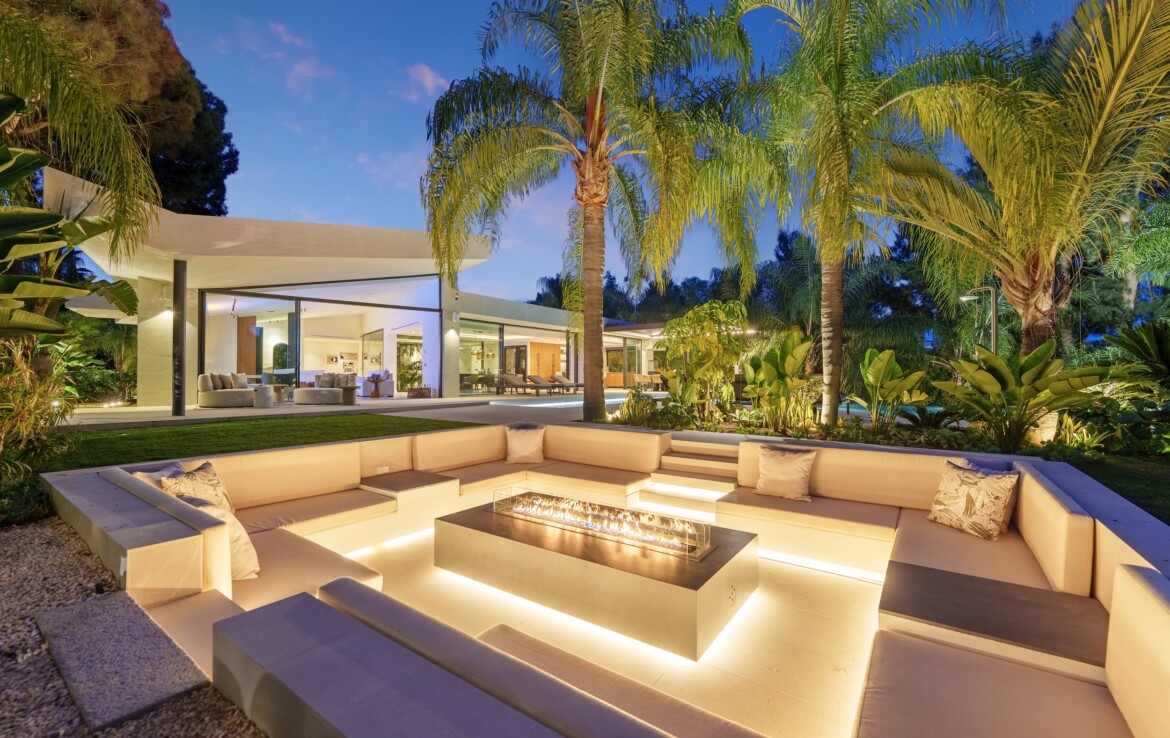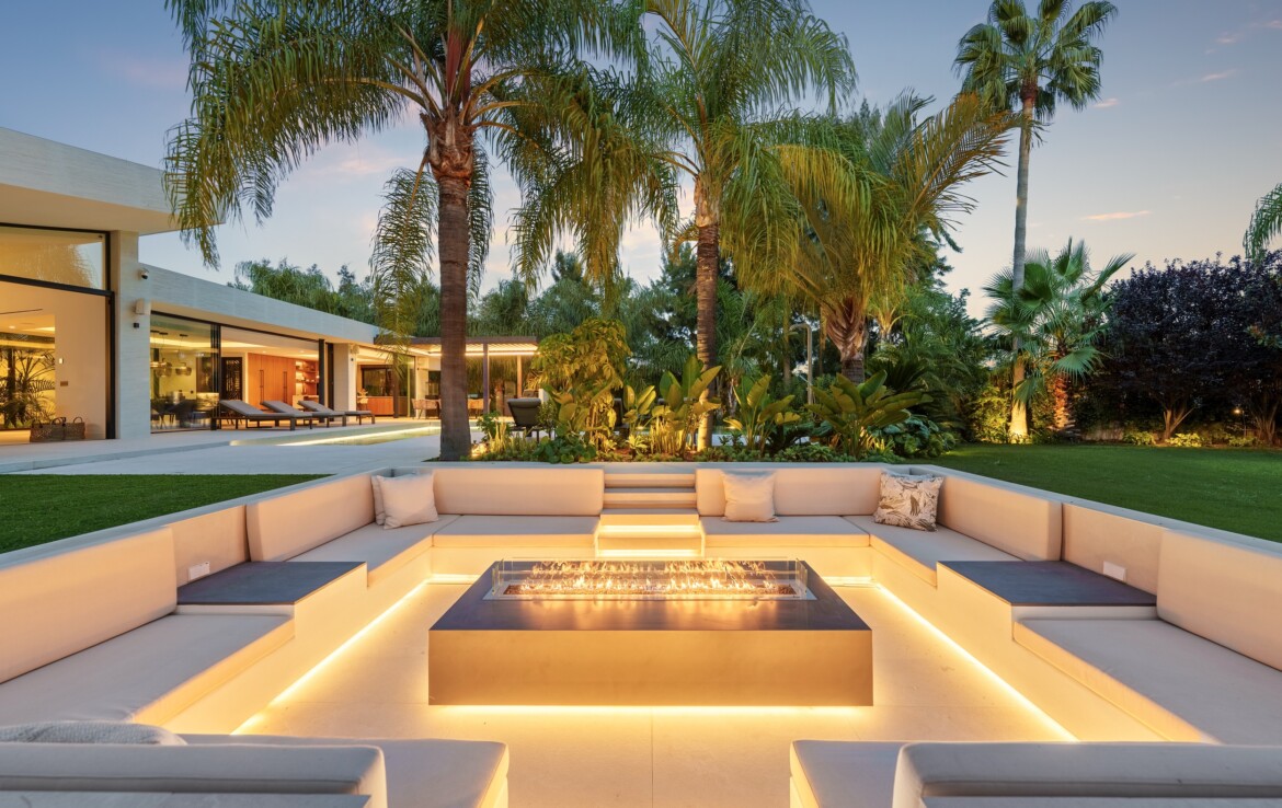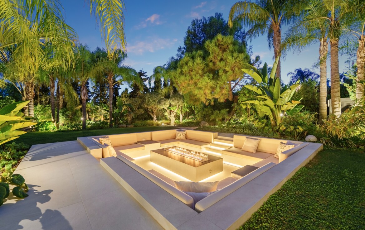 El exterior de Las Chapas 5 se caracteriza por sus jardines paisajísticos, palmeras maduras y múltiples zonas de relax. La piscina, con escalones y tumbonas a su alrededor, se sitúa como elemento central del espacio exterior. Otros atractivos incluyen una terraza comedor-cubierta y una zona de estar con hoguera integrada e iluminación incorporada, creando ambientes acogedores tanto para el día como para la noche. El diseño general garantiza la privacidad y, al mismo tiempo, permite disfrutar al máximo del clima de Marbella.