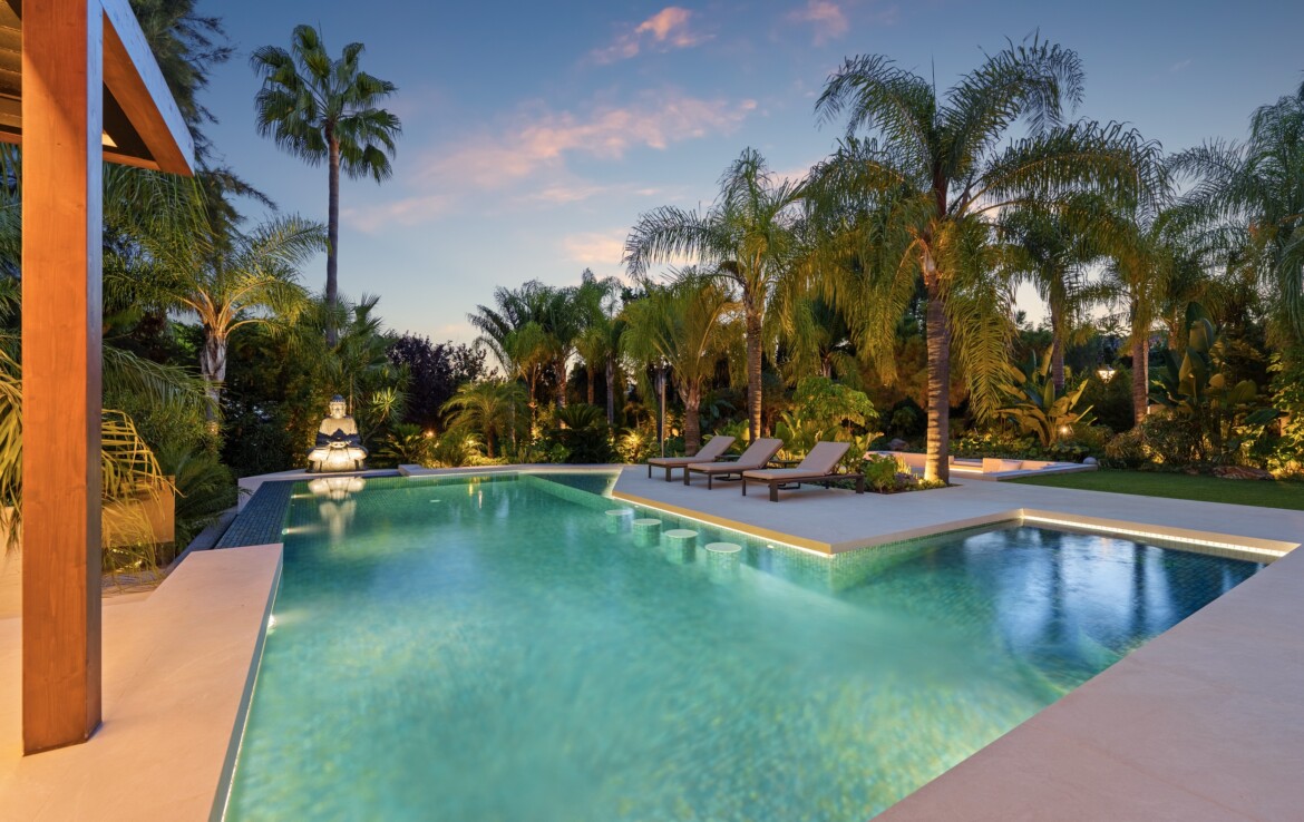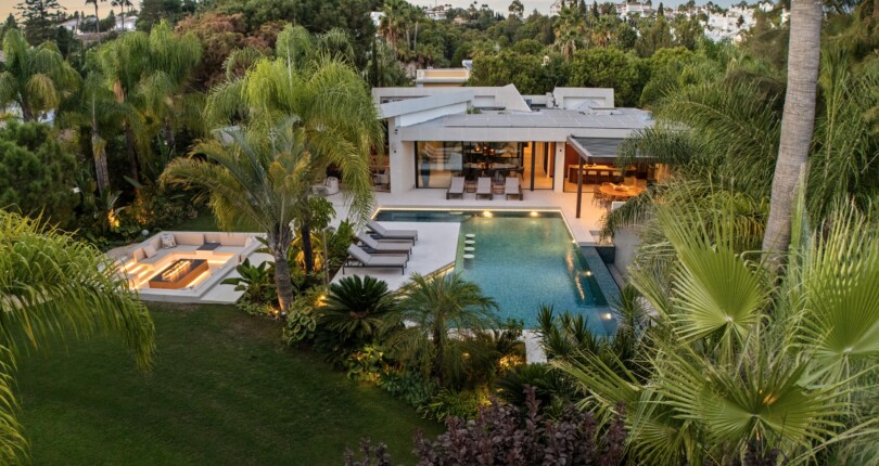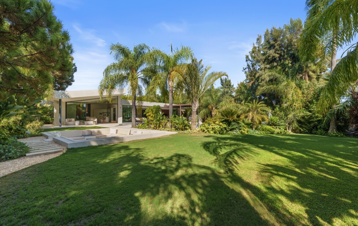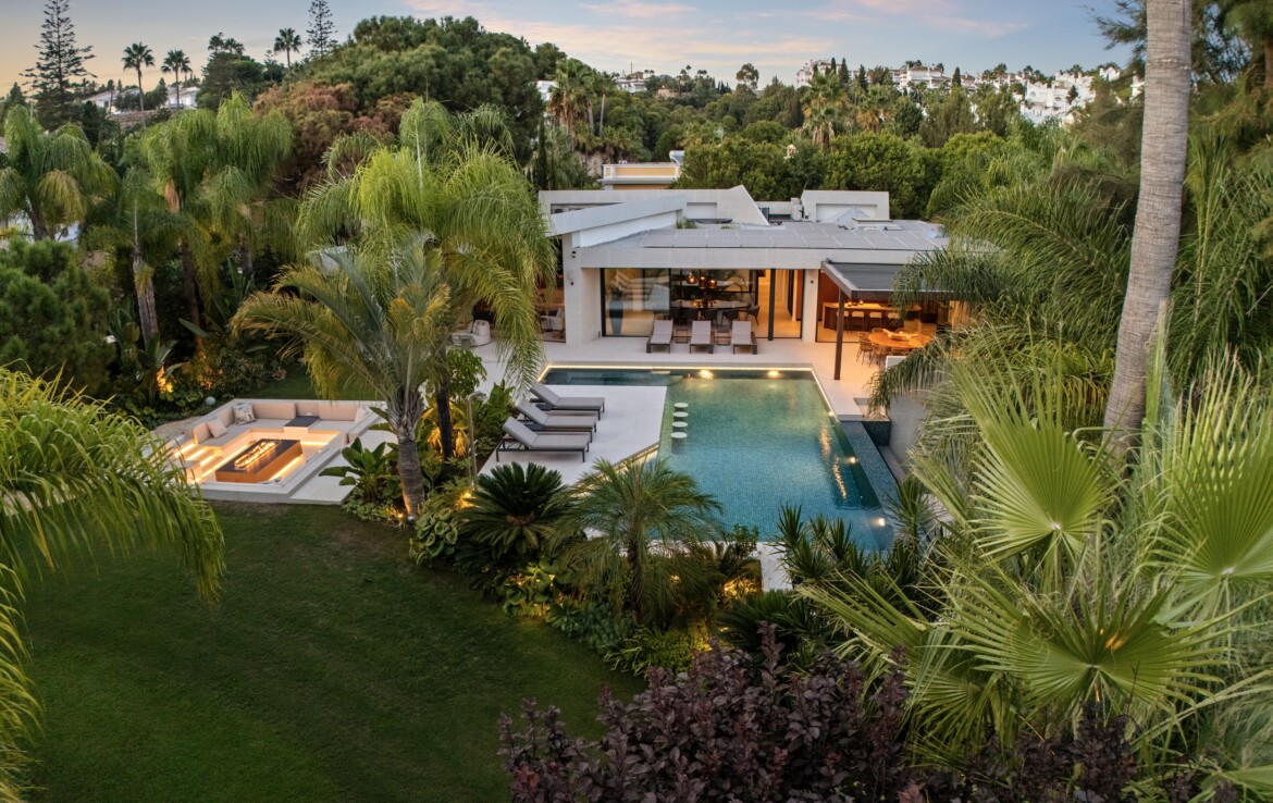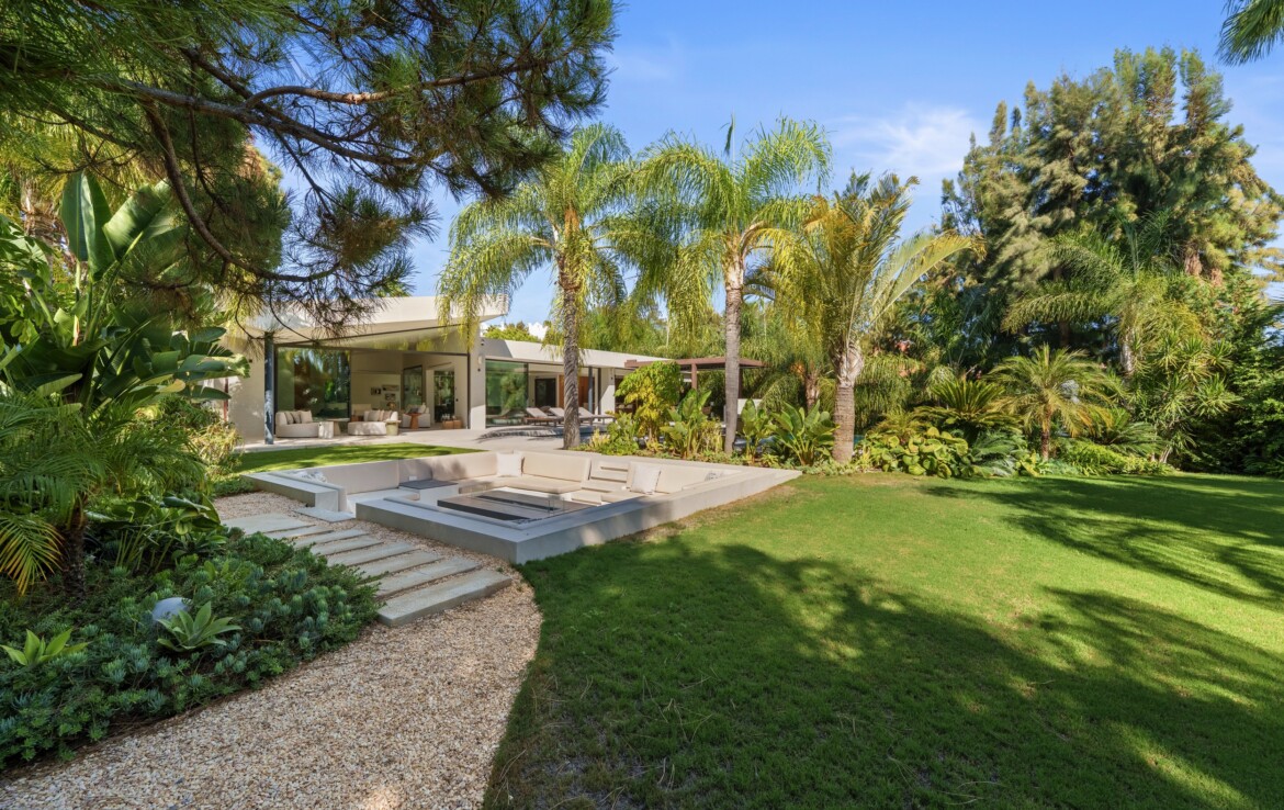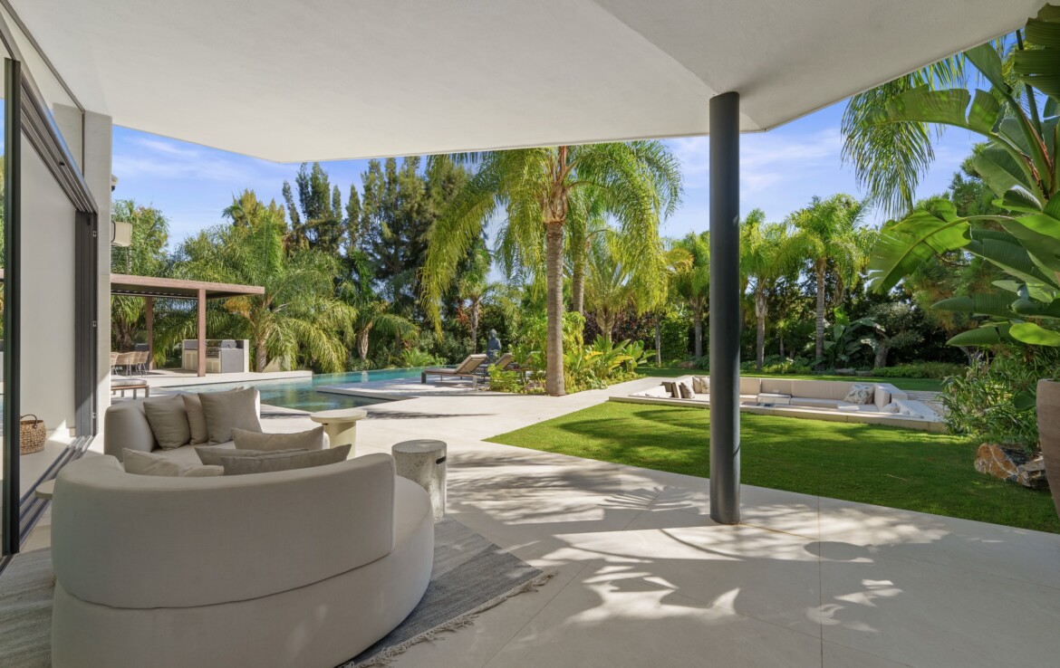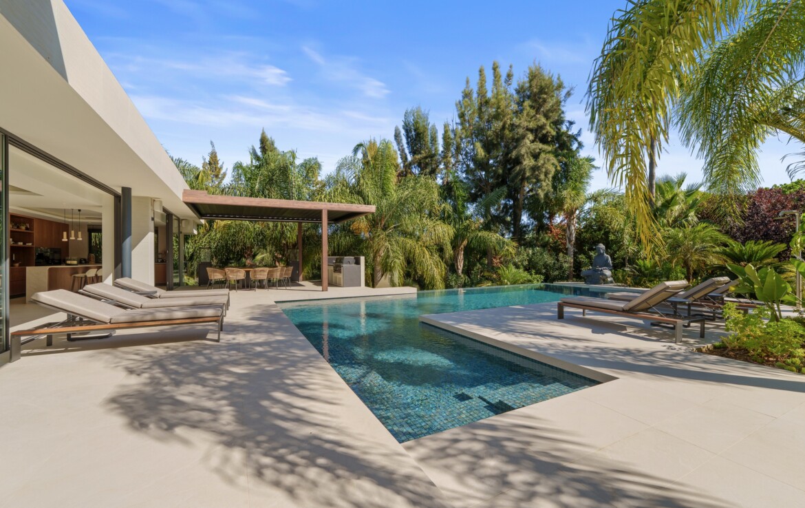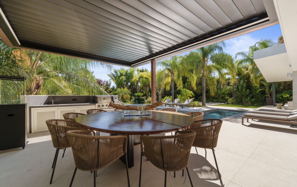 El exterior de Las Chapas 5 se caracteriza por sus jardines paisajísticos, palmeras maduras y múltiples zonas de relax. La piscina, con escalones y tumbonas a su alrededor, se sitúa como elemento central del espacio exterior. Otros atractivos incluyen una terraza comedor-cubierta y una zona de estar con hoguera integrada e iluminación incorporada, creando ambientes acogedores tanto para el día como para la noche. El diseño general garantiza la privacidad y, al mismo tiempo, permite disfrutar al máximo del clima de Marbella.