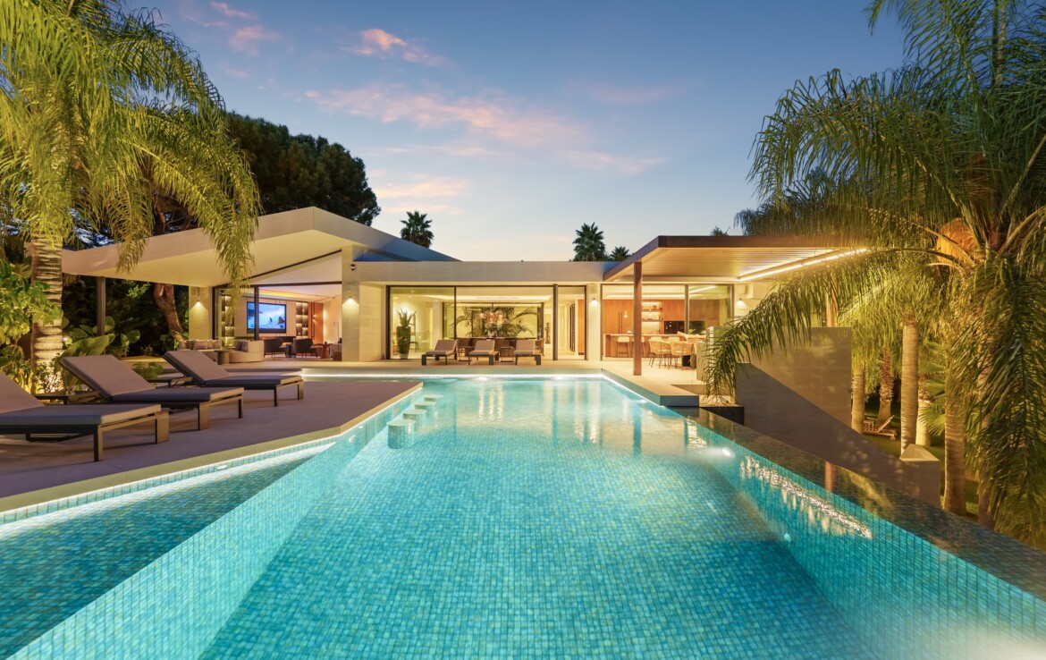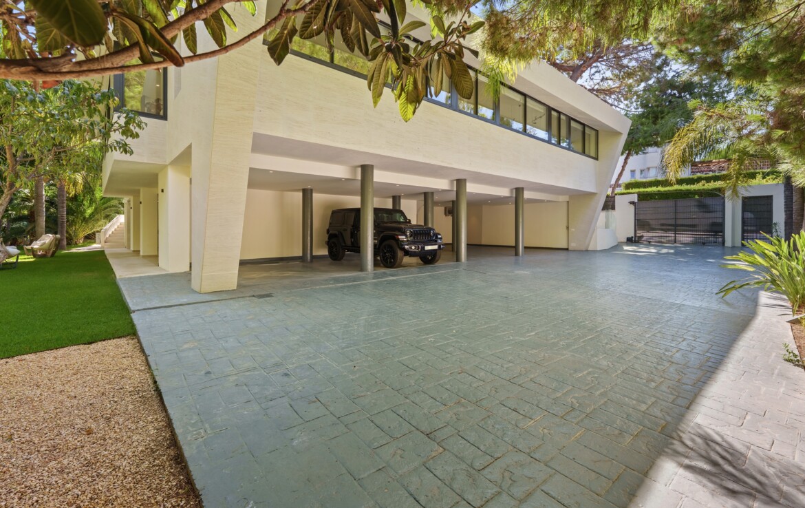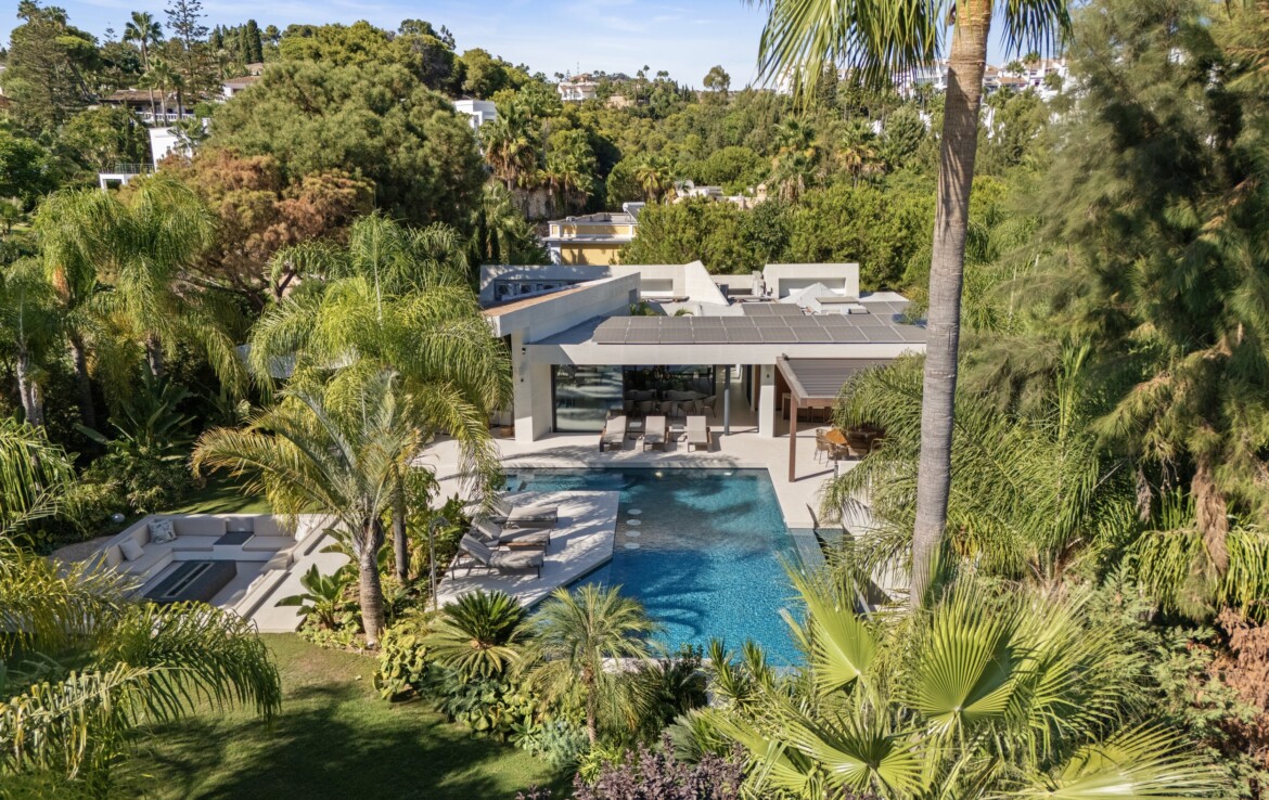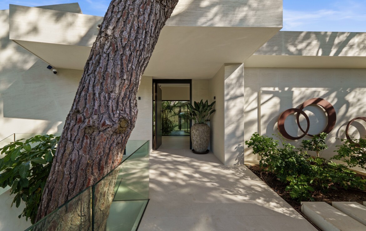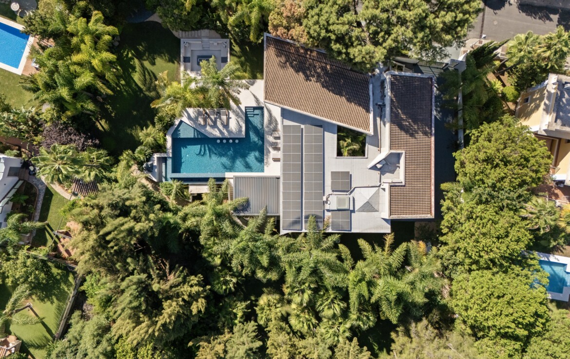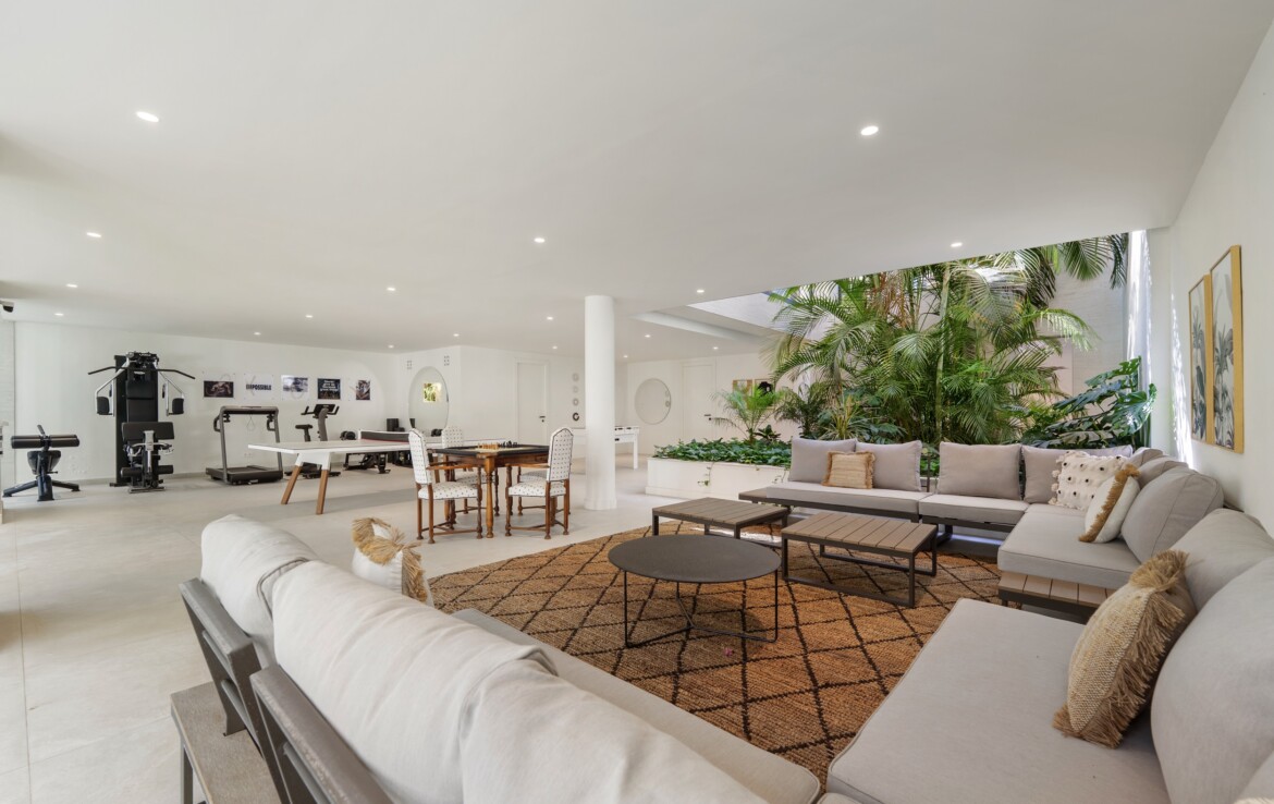 El exterior de Las Chapas 5 se caracteriza por sus jardines paisajísticos, palmeras maduras y múltiples zonas de relax. La piscina, con escalones y tumbonas a su alrededor, se sitúa como elemento central del espacio exterior. Otros atractivos incluyen una terraza comedor-cubierta y una zona de estar con hoguera integrada e iluminación incorporada, creando ambientes acogedores tanto para el día como para la noche. El diseño general garantiza la privacidad y, al mismo tiempo, permite disfrutar al máximo del clima de Marbella.