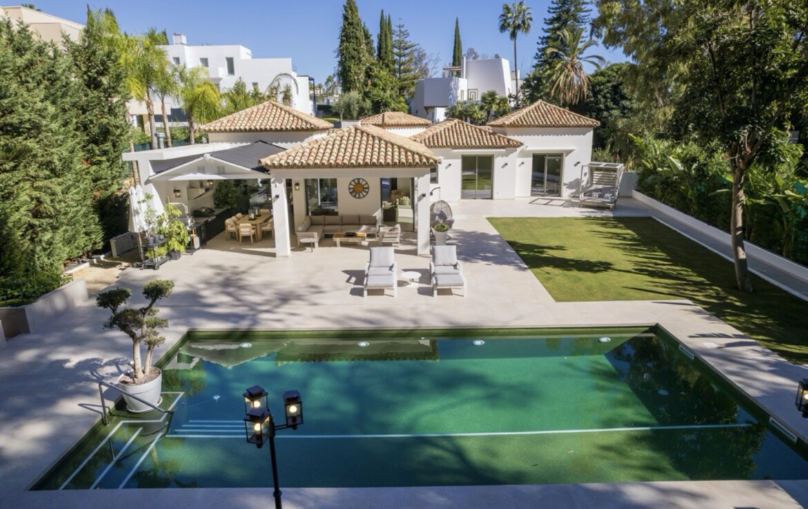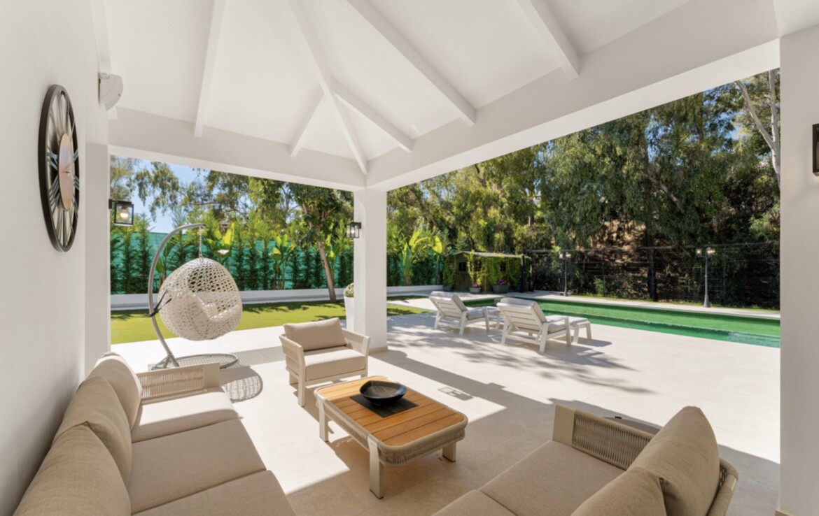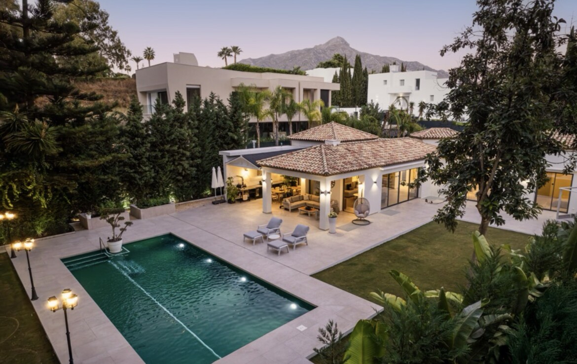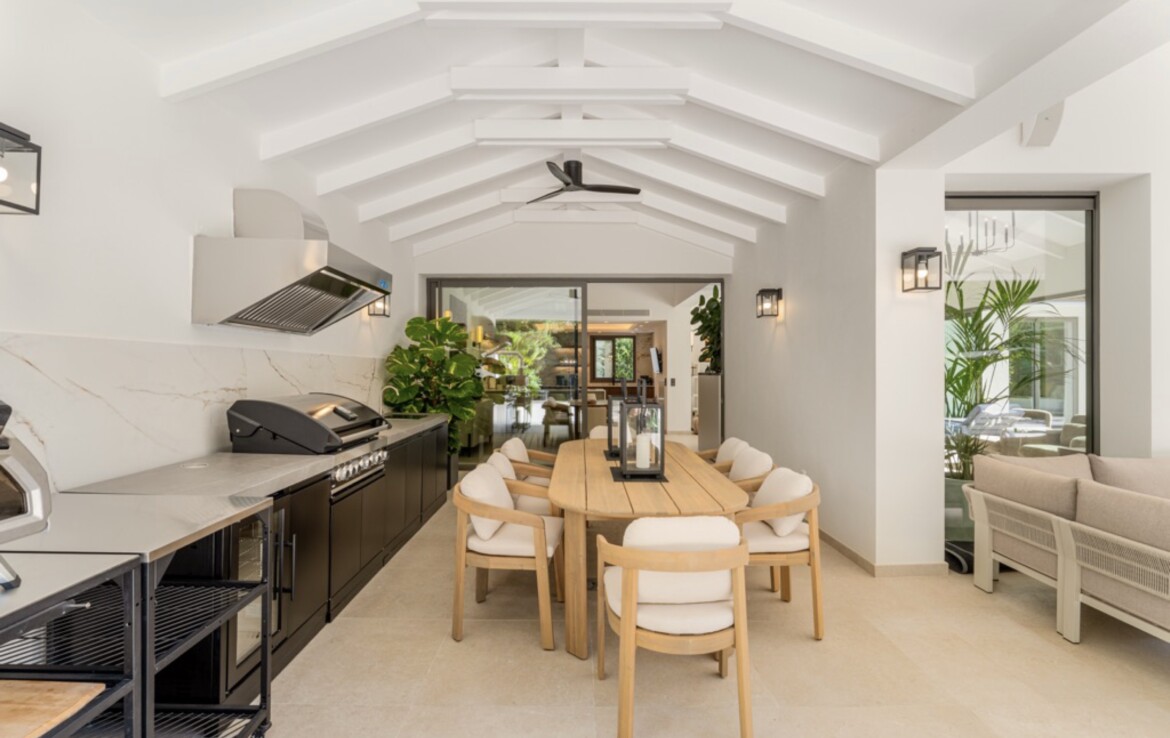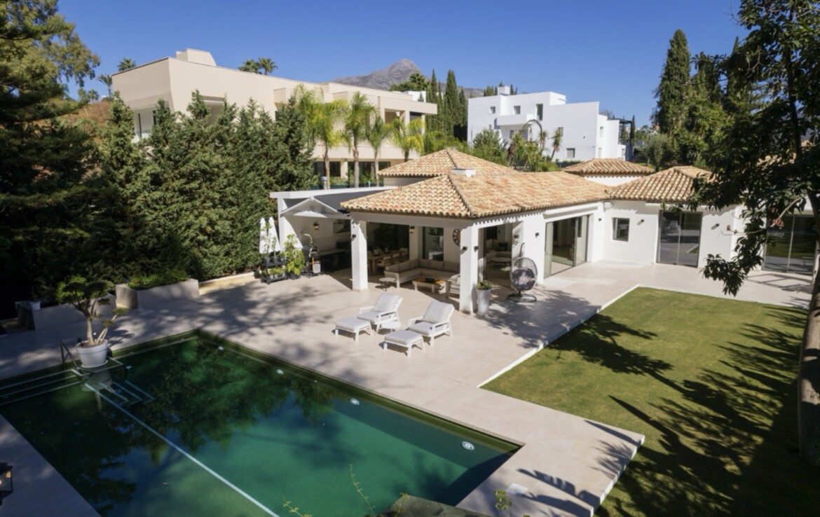 En el exterior, la villa sigue impresionando. Unos jardines con un hermoso diseño paisajístico rodean una piscina privada, preinstalada para calefacción, lo que permite disfrutarla durante todo el año. Las terrazas cuentan con una cocina exterior, un comedor y una zona chill-out, ideales para disfrutar del aire libre. La villa ofrece total privacidad y amplitud, manteniendo una estrecha conexión con el entorno natural, creando un auténtico oasis en una de las urbanizaciones más exclusivas de Nueva Andalucía.