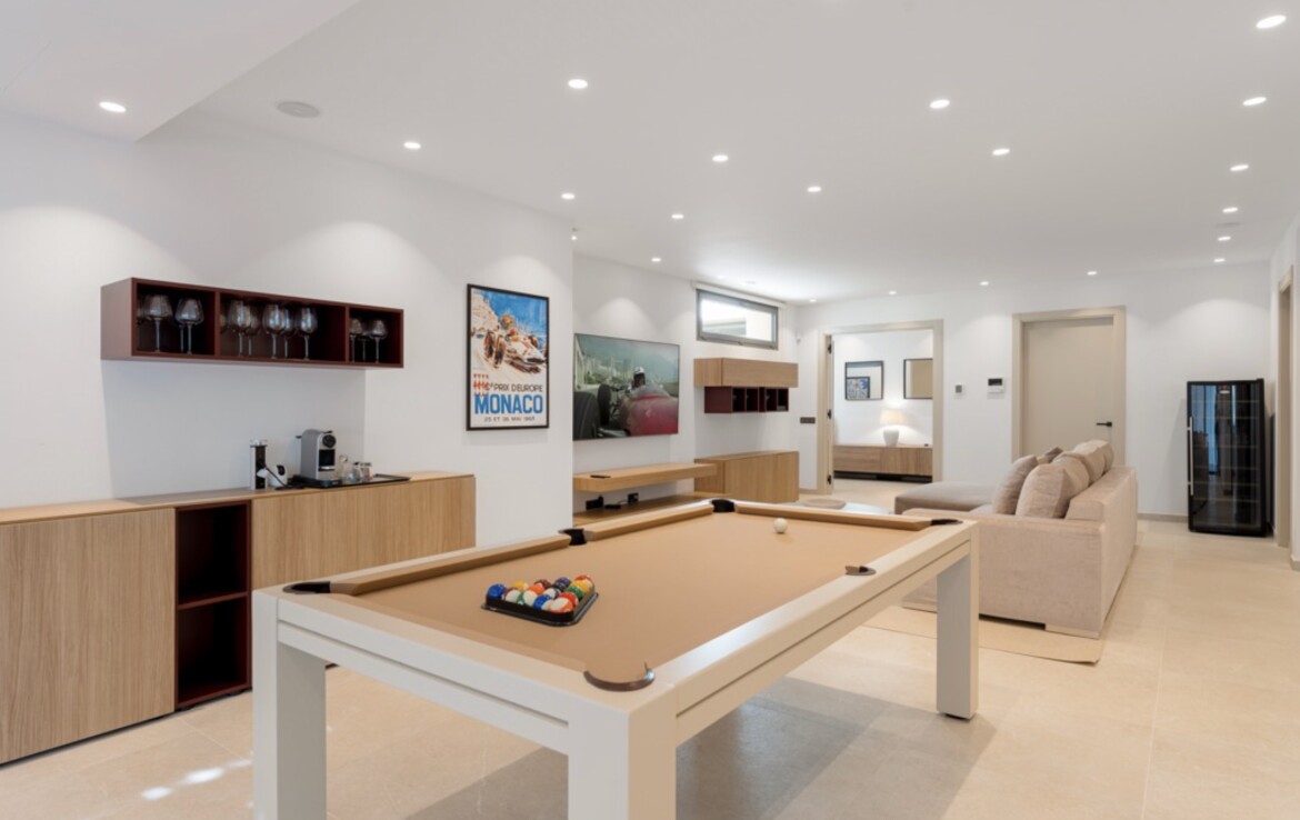 Su orientación suroeste asegura luz natural durante todo el día y hermosas vistas del atardecer sobre el valle. Una majestuosa entrada circular con capacidad para 10 coches conduce a la entrada principal, marcando la pauta de la elegancia de la propiedad. La planta baja se abre a un espacioso recibidor que da paso a una luminosa sala de estar y una moderna cocina abierta, la cual se extiende hacia dos comedores independientes con impresionantes techos abovedados. Tres de los dormitorios en suite de la villa se encuentran en esta planta, cada uno con grandes ventanales que conectan el interior con las terrazas y ofrecen vistas al amplio jardín. La planta inferior ha sido diseñada para el ocio y el entretenimiento, y dos dormitorios adicionales garantizan la comodidad y la privacidad de los huéspedes. Una elegante sala de juegos con zona de estar y mesa de billar sirve como punto de encuentro social, mientras que una lavandería totalmente equipada facilita la vida diaria. Los materiales naturales, los detalles en madera y los elegantes azulejos crean una atmósfera cálida y acogedora que complementa la estética contemporánea de la villa.