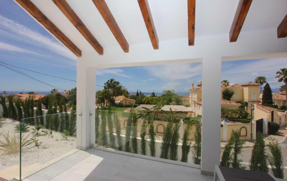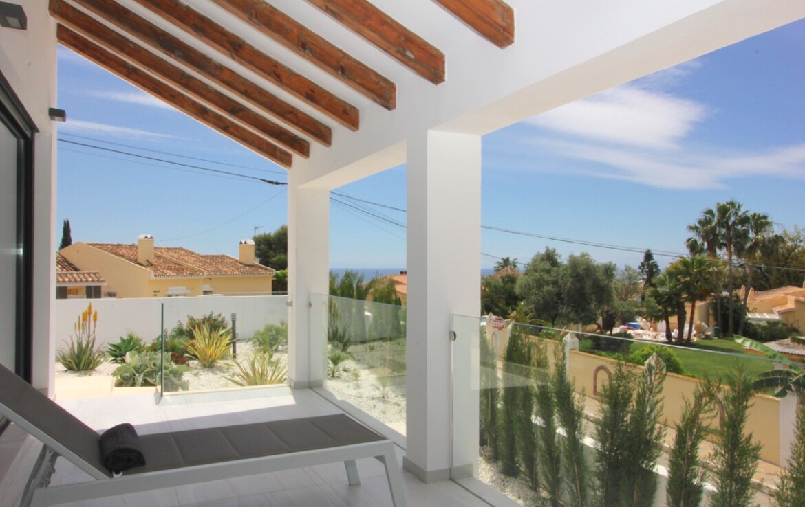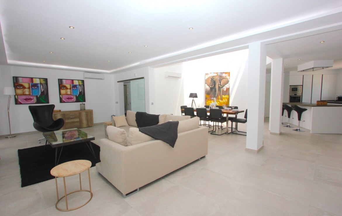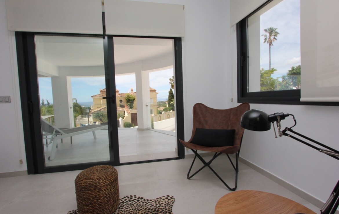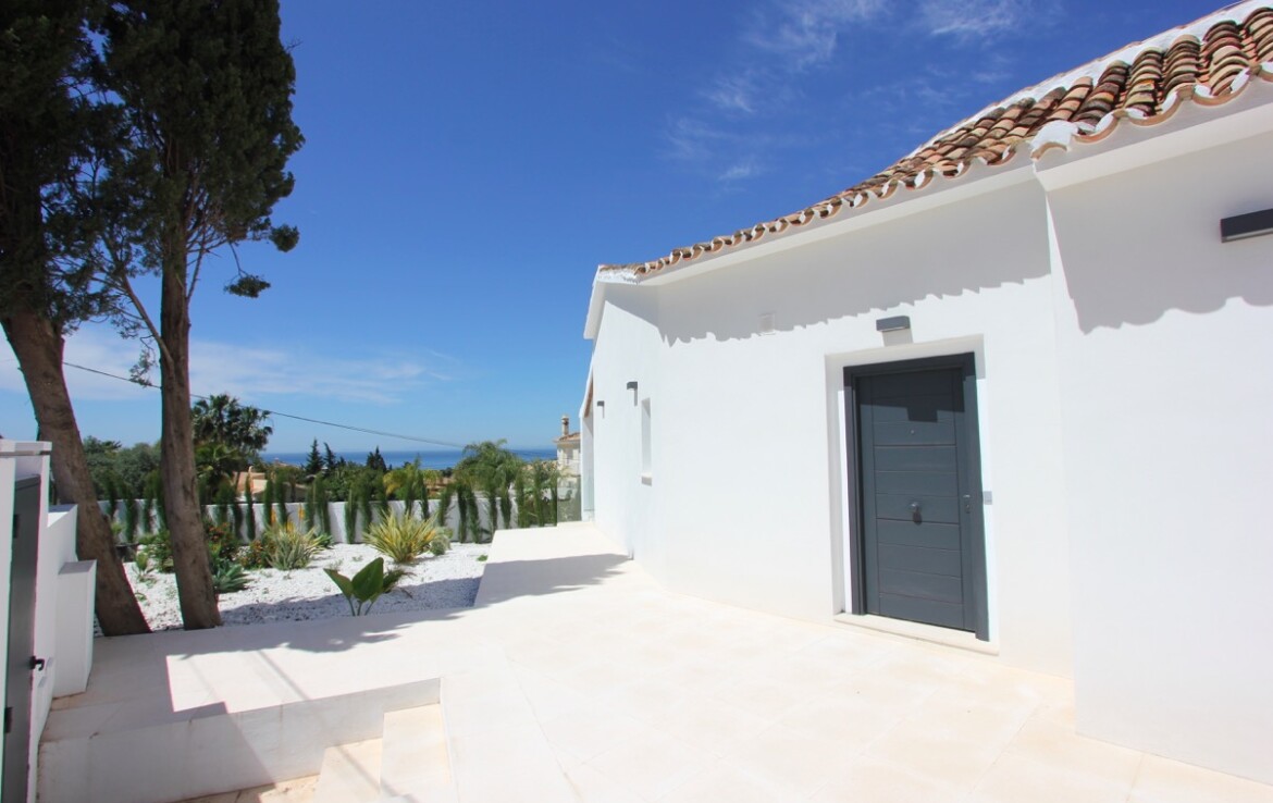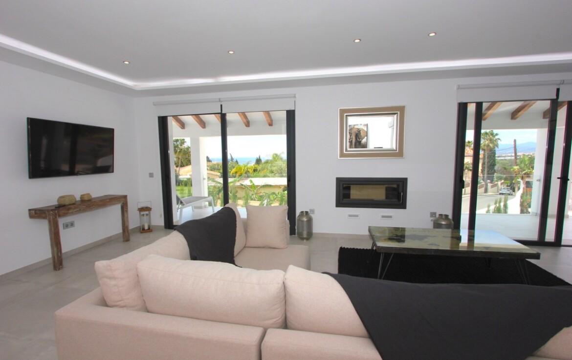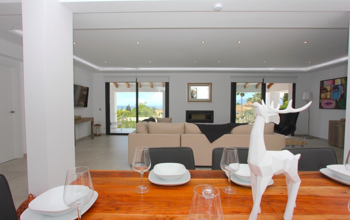 La vivienda ha sido completamente renovada y combina a la perfección un elegante estilo moderno con toques andaluces, ofreciendo espacios abiertos, luminosos y acabados de alta calidad. Desde la entrada principal apreciamos un amplio salón con vistas al mar, un comedor bañado por la luz natural gracias a una gran cúpula de cristal y una espectacular cocina abierta que conecta con ambas estancias.