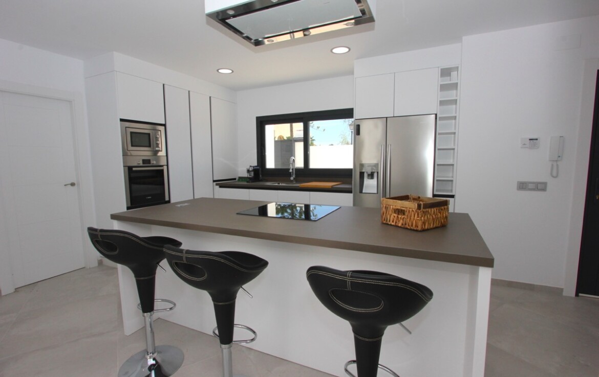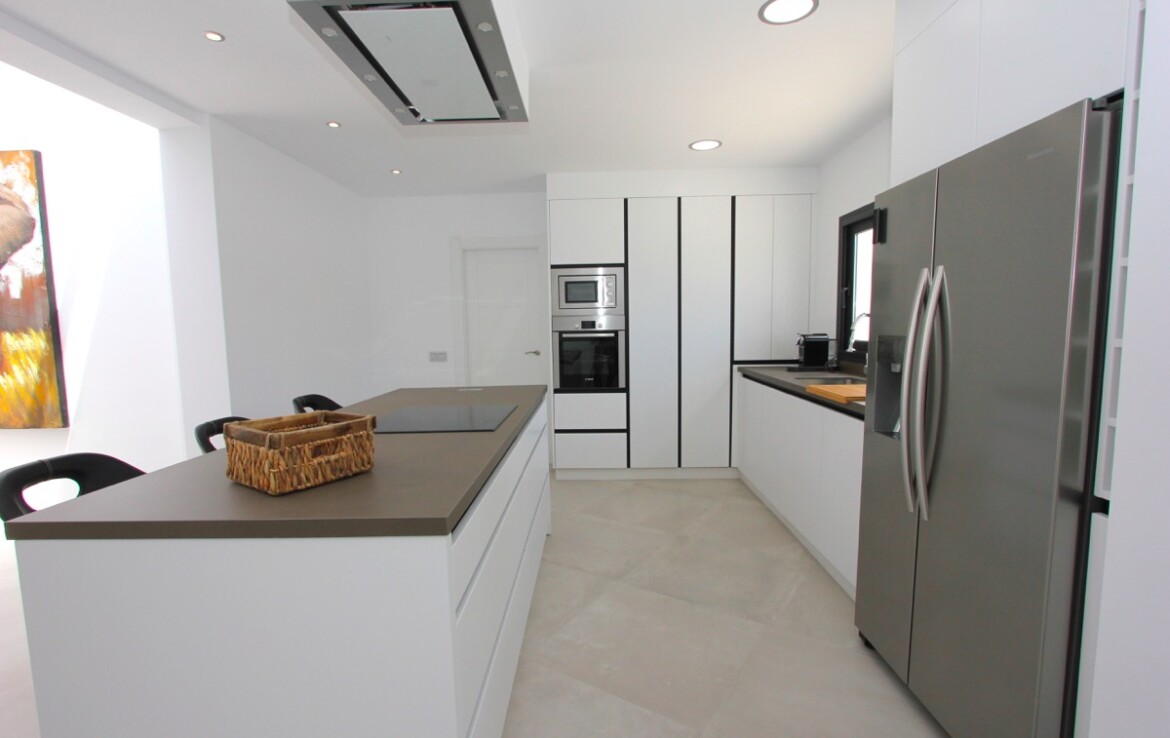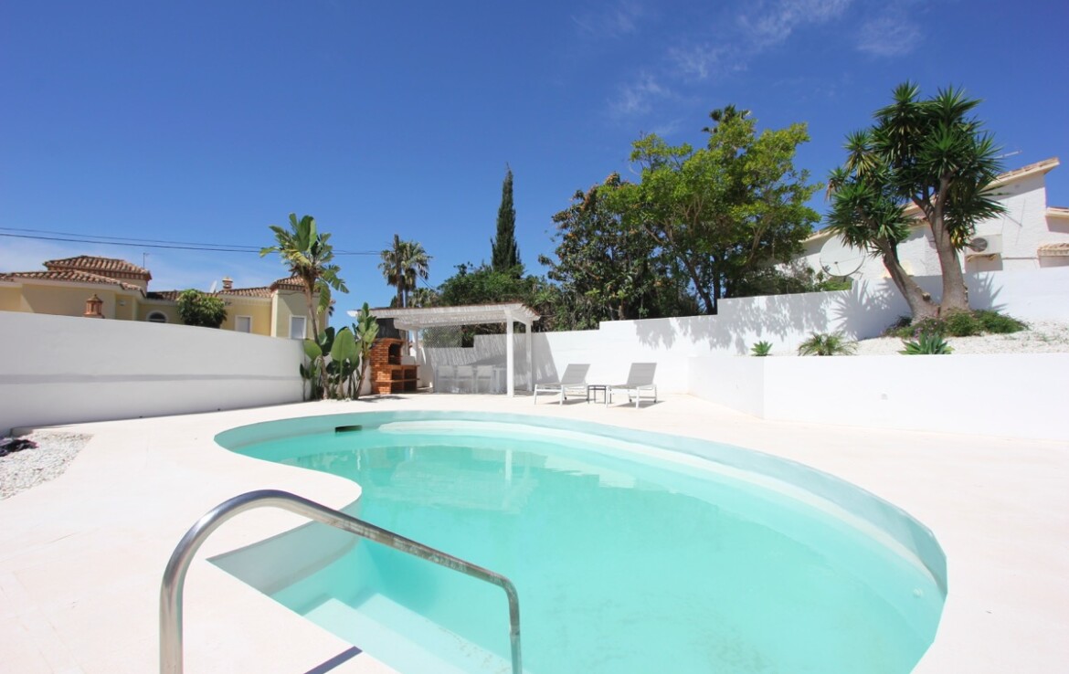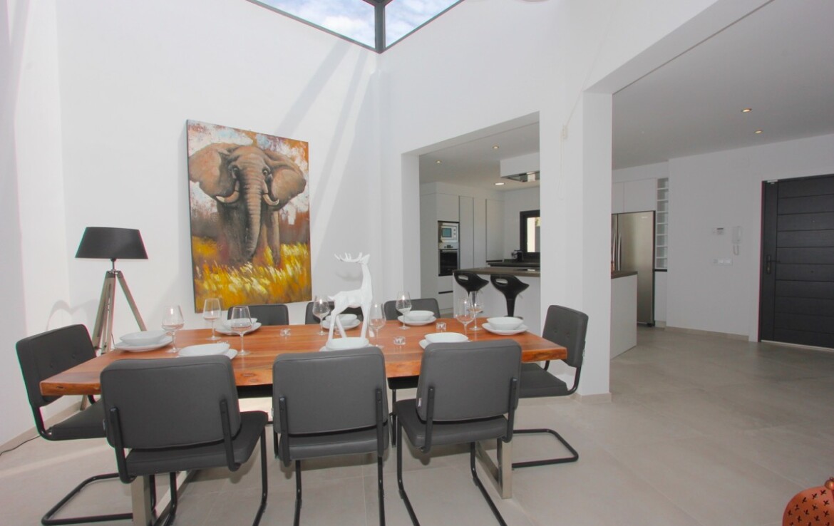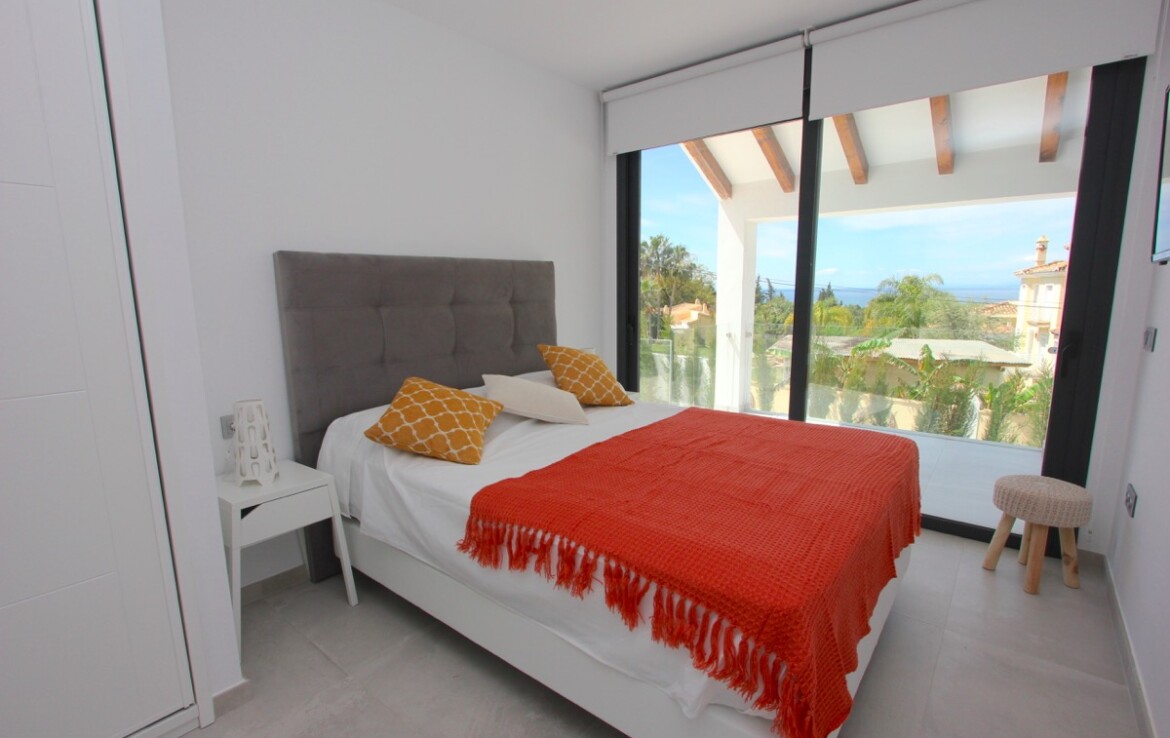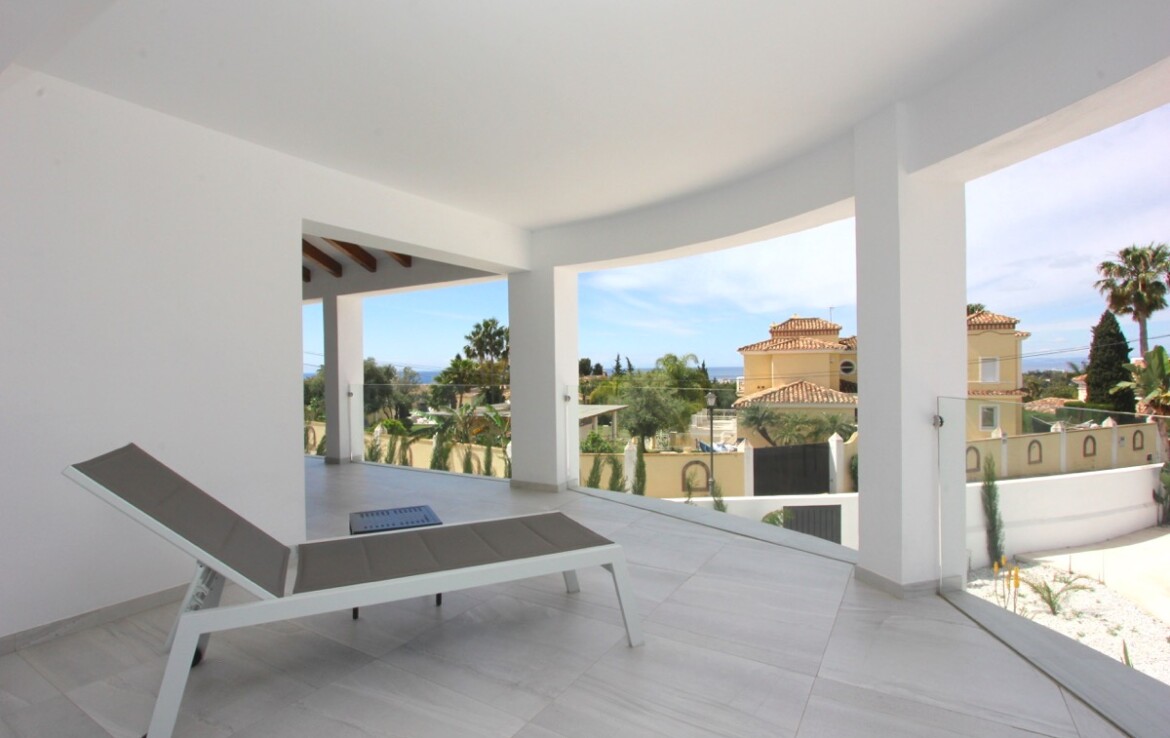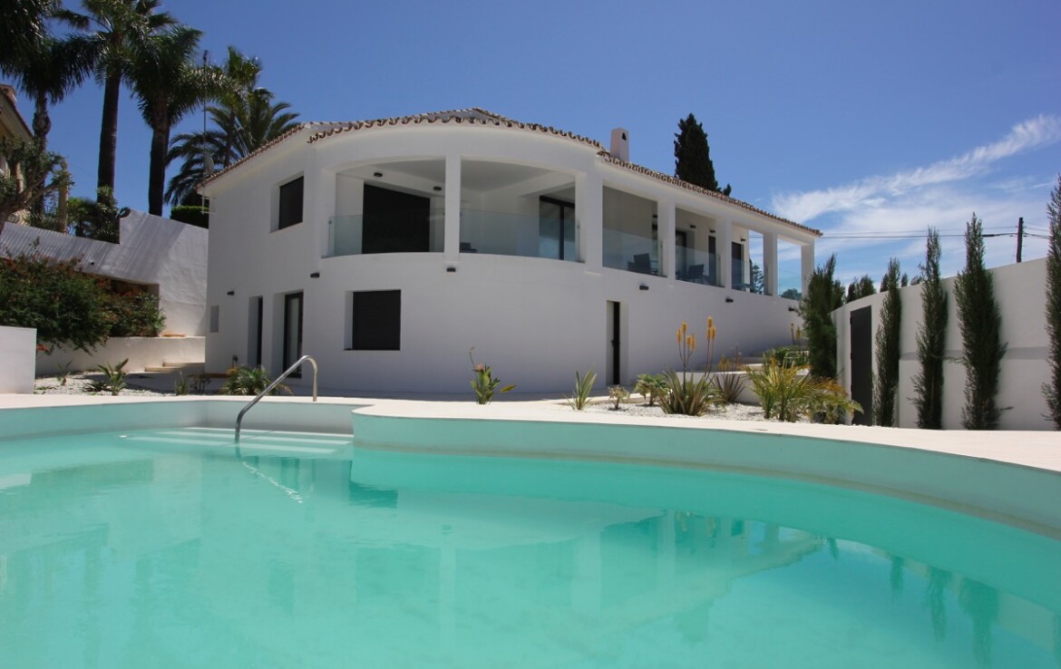 La vivienda ha sido completamente renovada y combina a la perfección un elegante estilo moderno con toques andaluces, ofreciendo espacios abiertos, luminosos y acabados de alta calidad. Desde la entrada principal apreciamos un amplio salón con vistas al mar, un comedor bañado por la luz natural gracias a una gran cúpula de cristal y una espectacular cocina abierta que conecta con ambas estancias.