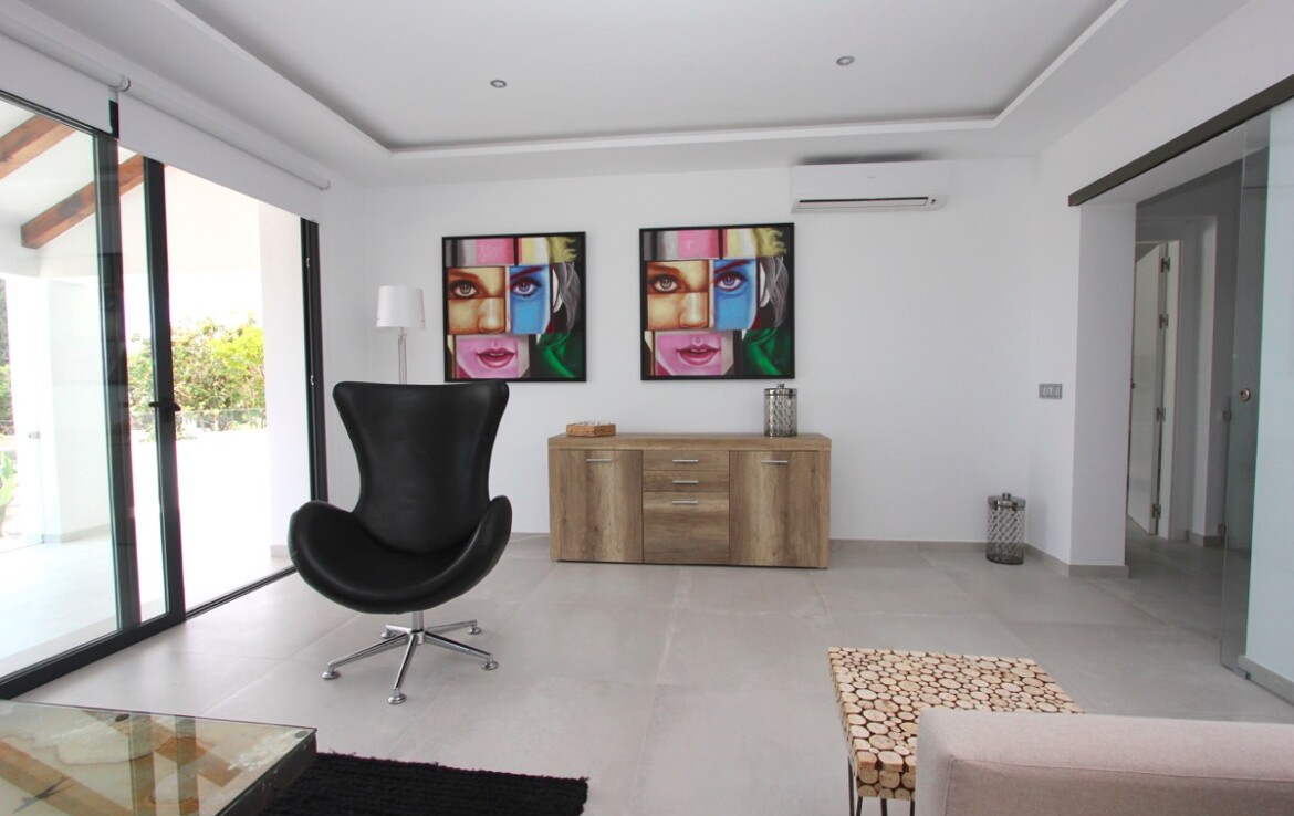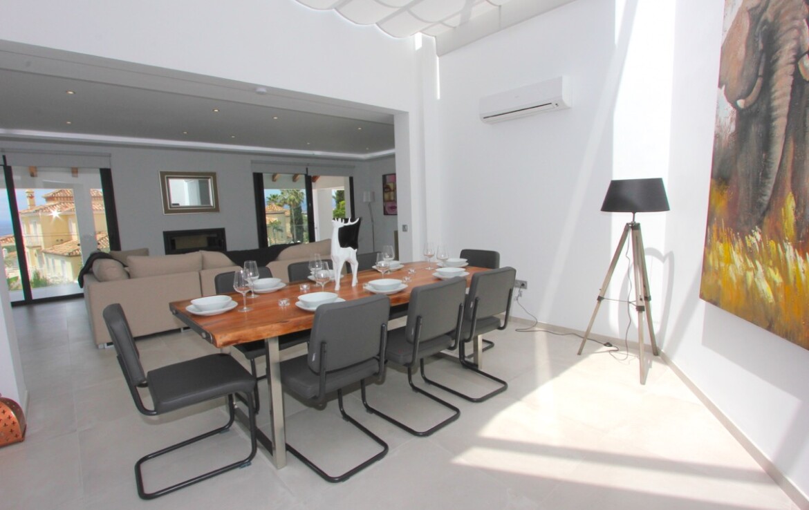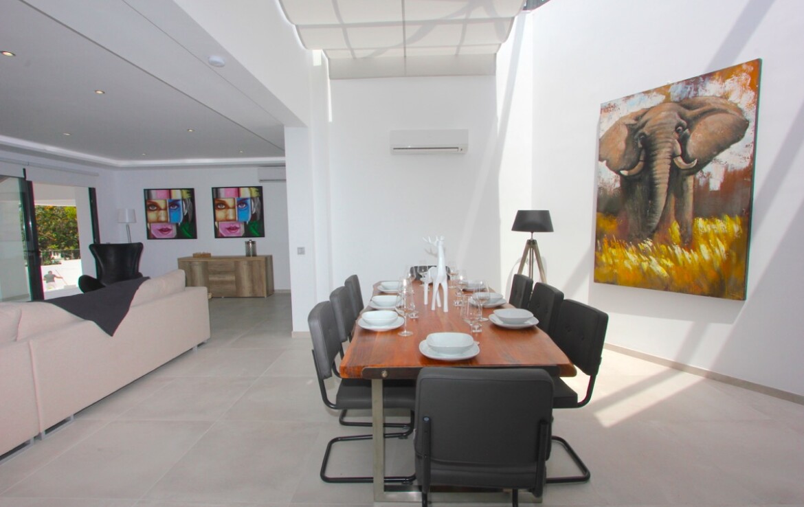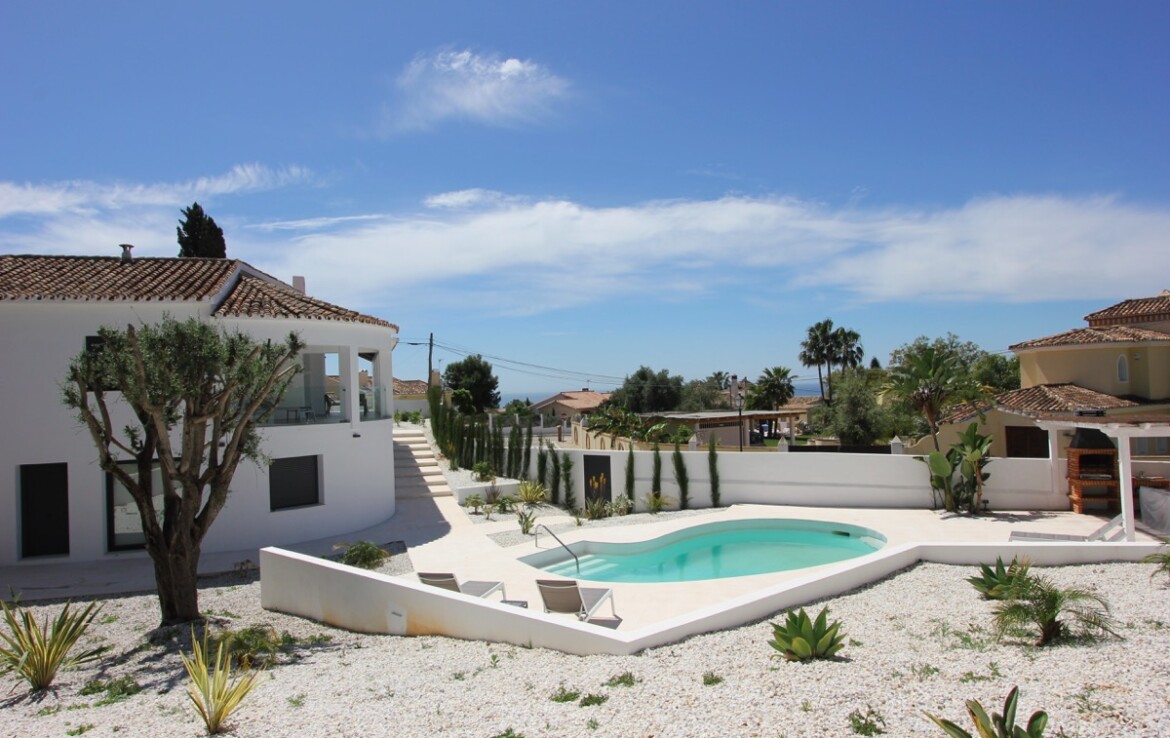 Ubicada en una parcela rectangular con su lado más largo orientado al sur, la propiedad disfruta de excelentes vistas panorámicas al mar. La villa se ha construido en uno de los laterales de la parcela, lo que permite un amplio jardín con zona de piscina, ideal para disfrutar del clima mediterráneo.
