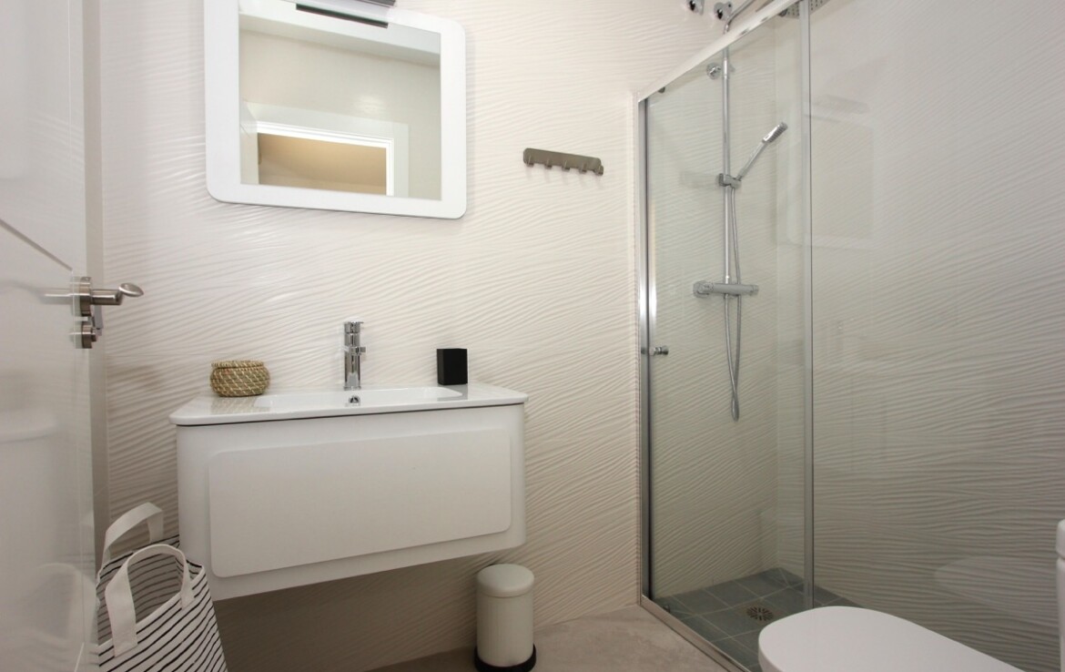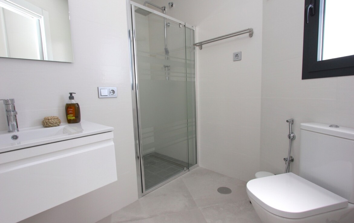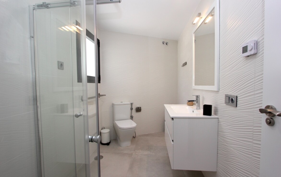 En la planta principal se encuentran tres dormitorios, todos con baño en suite, un aseo de cortesía y acceso directo al garaje desde la cocina. La planta inferior, a la que se accede por escalera interior, cuenta con una sala de estar adicional, dos dormitorios y un baño completo.