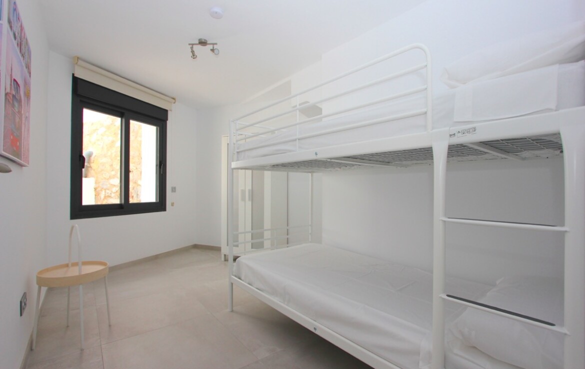 La villa dispone de cinco dormitorios en total: cuatro con camas dobles de gran tamaño y uno con literas, con capacidad máxima para diez personas.