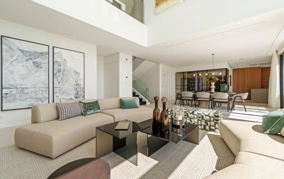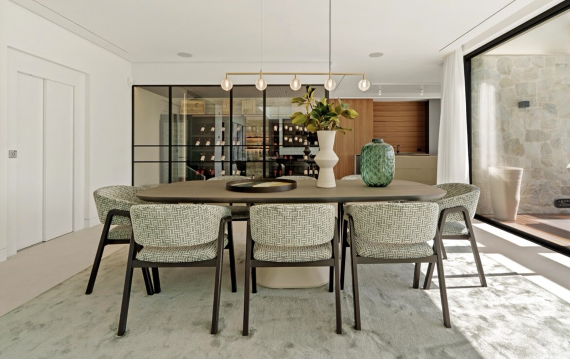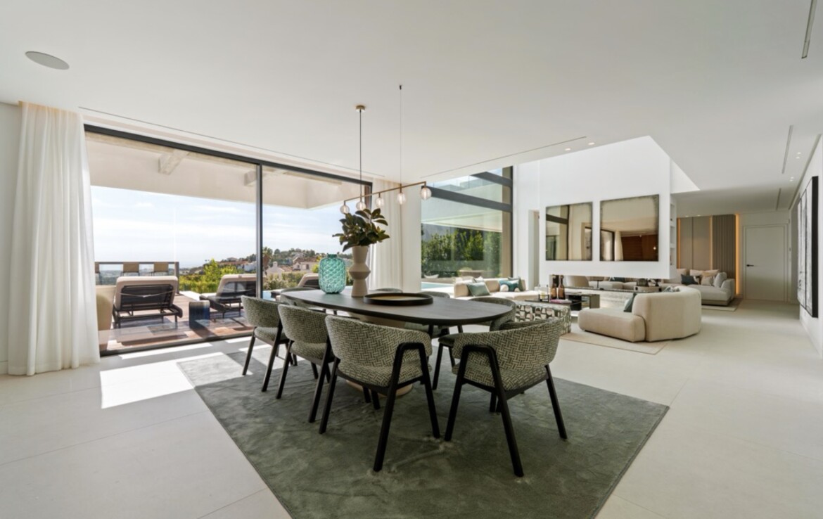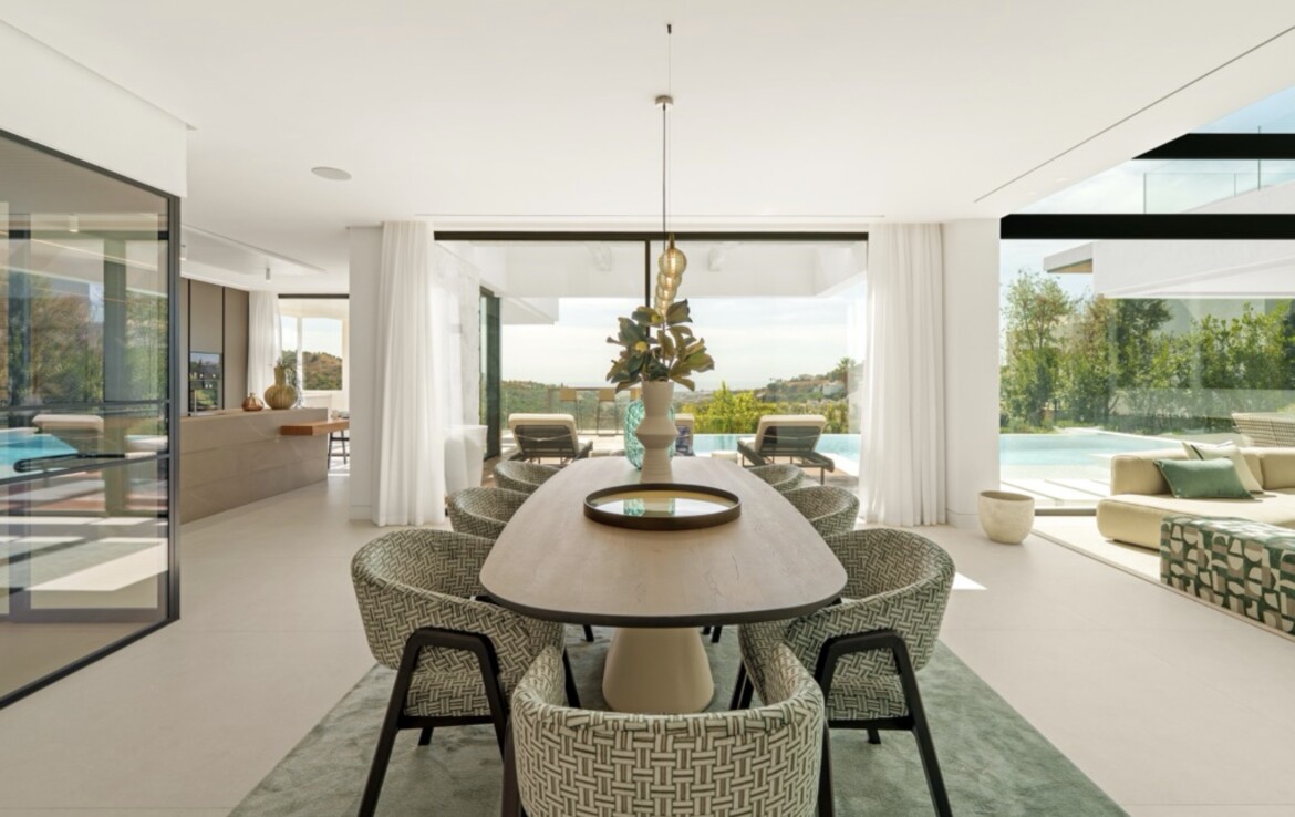 La casa se estructura en torno a un concepto de planta abierta, que conecta fluidamente las zonas de estar, comedor y cocina con amplias terrazas. Los ventanales de suelo a techo crean una transición natural entre los espacios interiores y exteriores, potenciando la sensación de luminosidad y amplitud. Múltiples zonas de estar y comedor, tanto interiores como exteriores, hacen que la propiedad sea ideal para la vida familiar contemporánea y para recibir invitados.