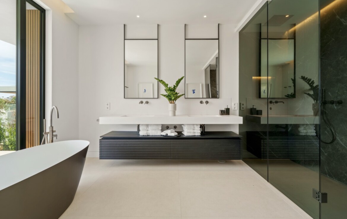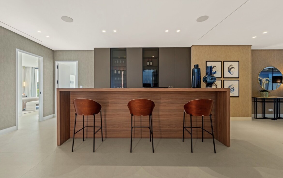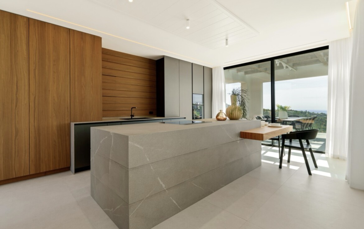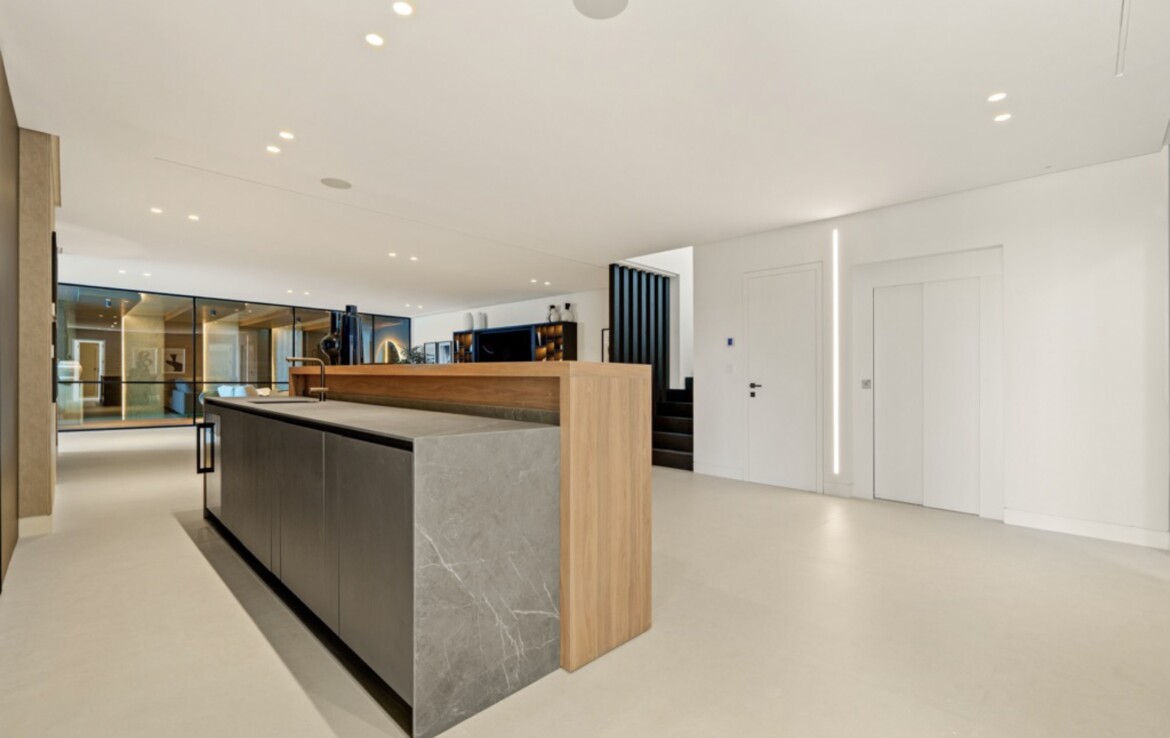 La casa se estructura en torno a un concepto de planta abierta, que conecta fluidamente las zonas de estar, comedor y cocina con amplias terrazas. Los ventanales de suelo a techo crean una transición natural entre los espacios interiores y exteriores, potenciando la sensación de luminosidad y amplitud. Múltiples zonas de estar y comedor, tanto interiores como exteriores, hacen que la propiedad sea ideal para la vida familiar contemporánea y para recibir invitados.