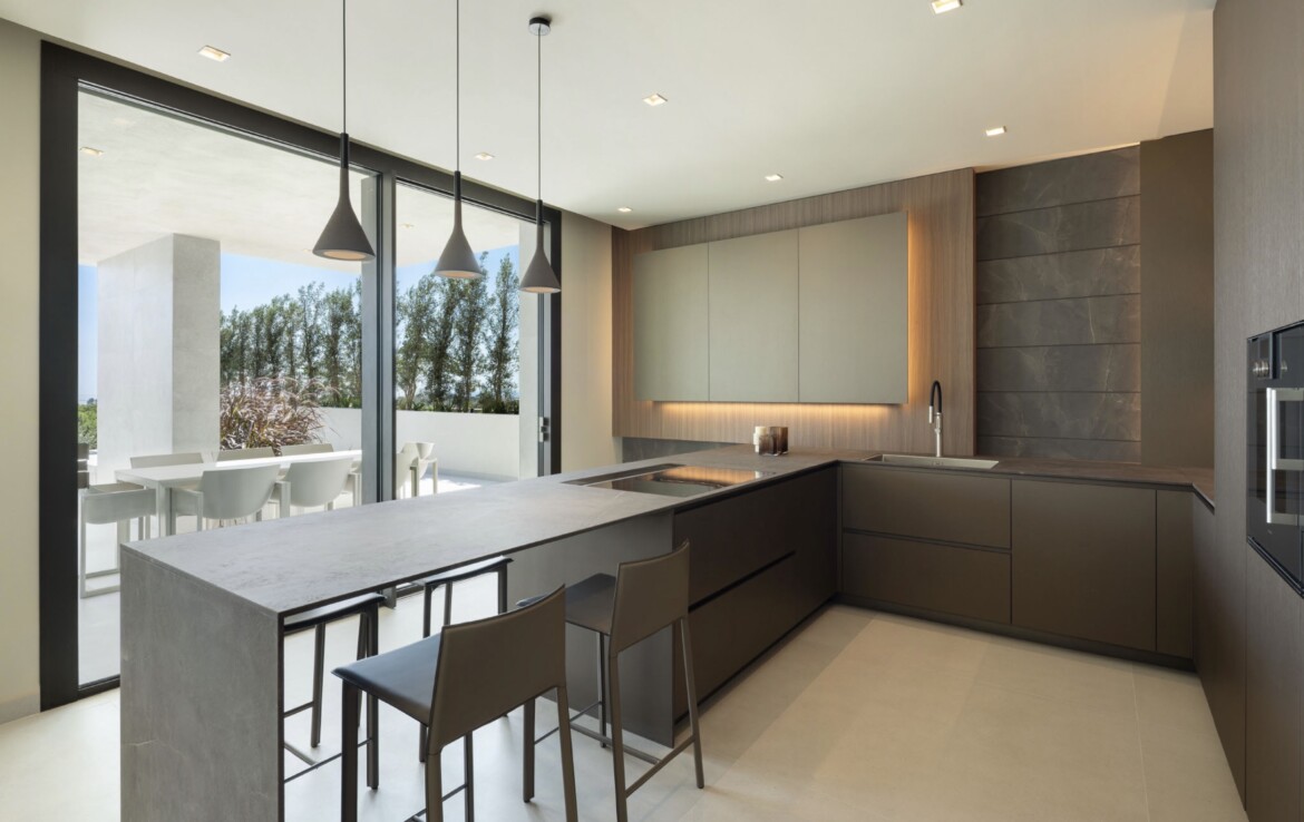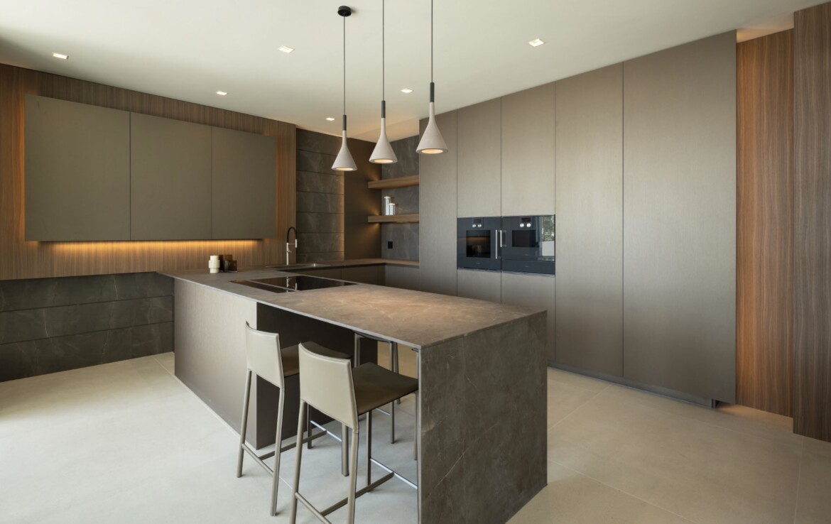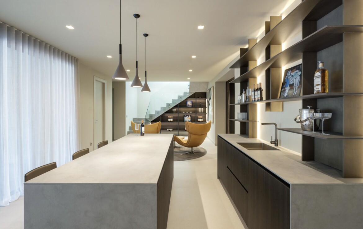 Cada rincón de la casa exhibe acabados de primera calidad y detalles sofisticados. La cocina de diseño Modulnova y la carpintería en toda la vivienda, junto con los amplios ventanales de aluminio Schüco (de 2300 mm y 2500 mm), inundan los interiores de luz natural, mientras que la puerta principal pivotante Schüco con iluminación LED constituye una audaz declaración arquitectónica.