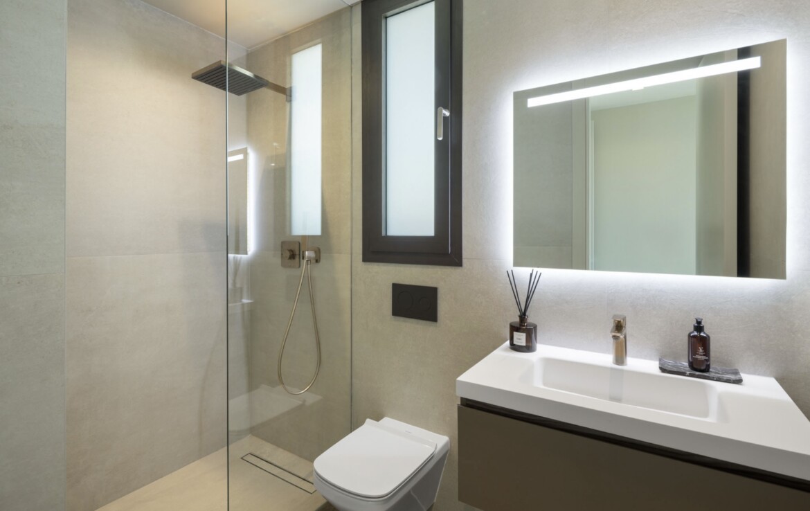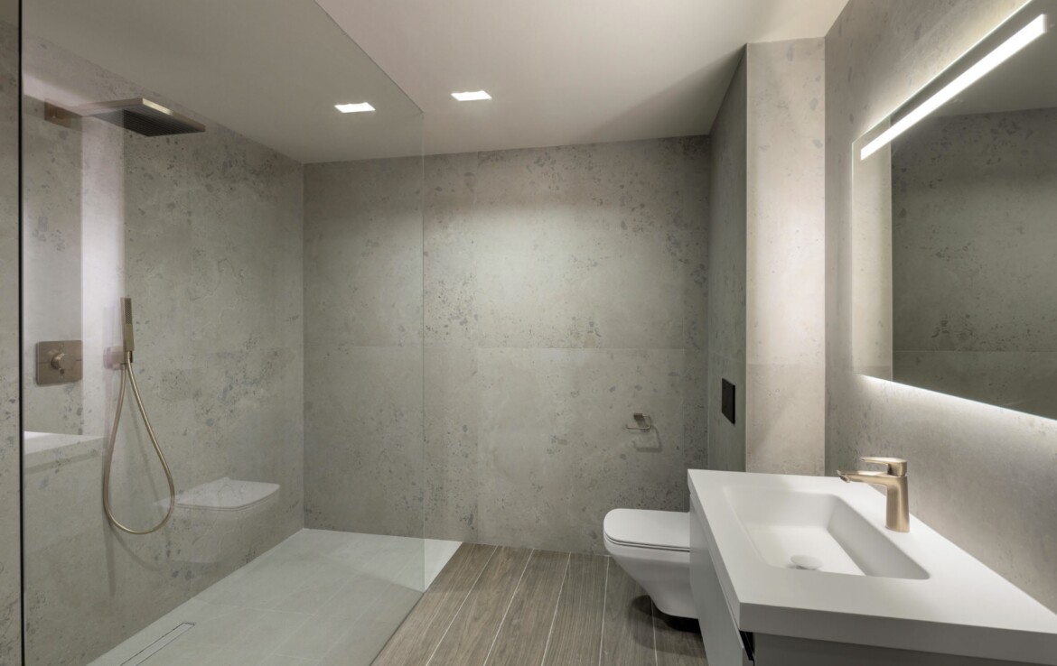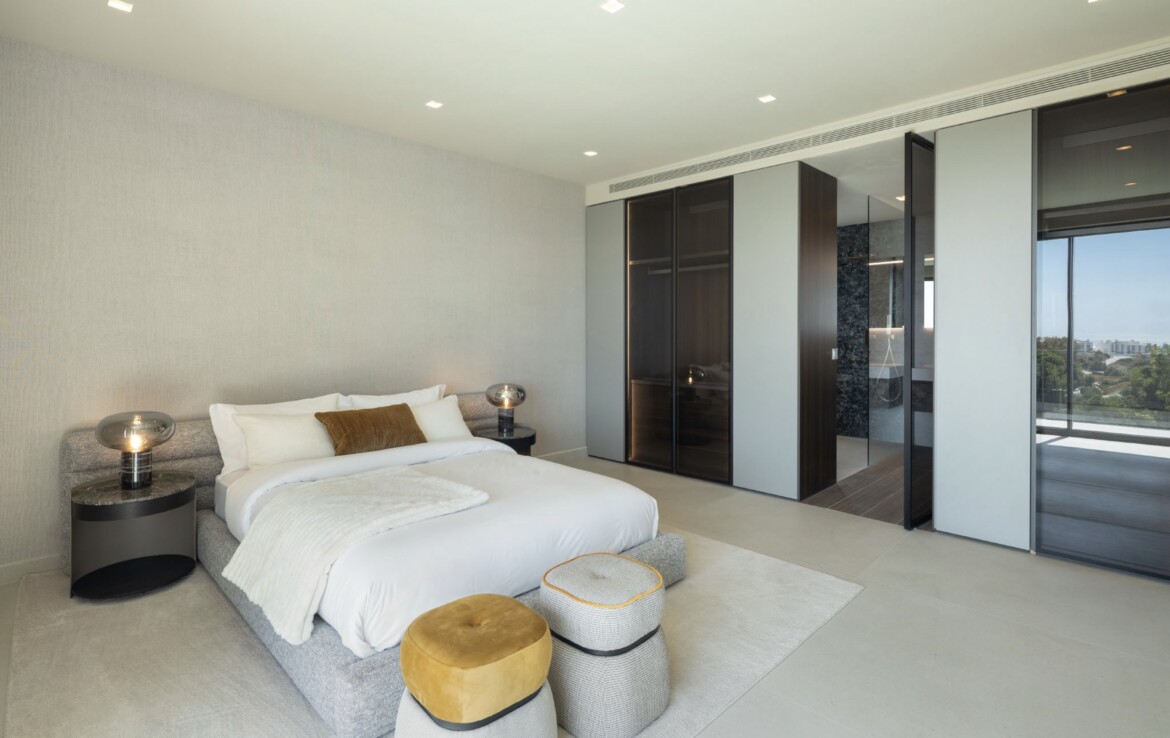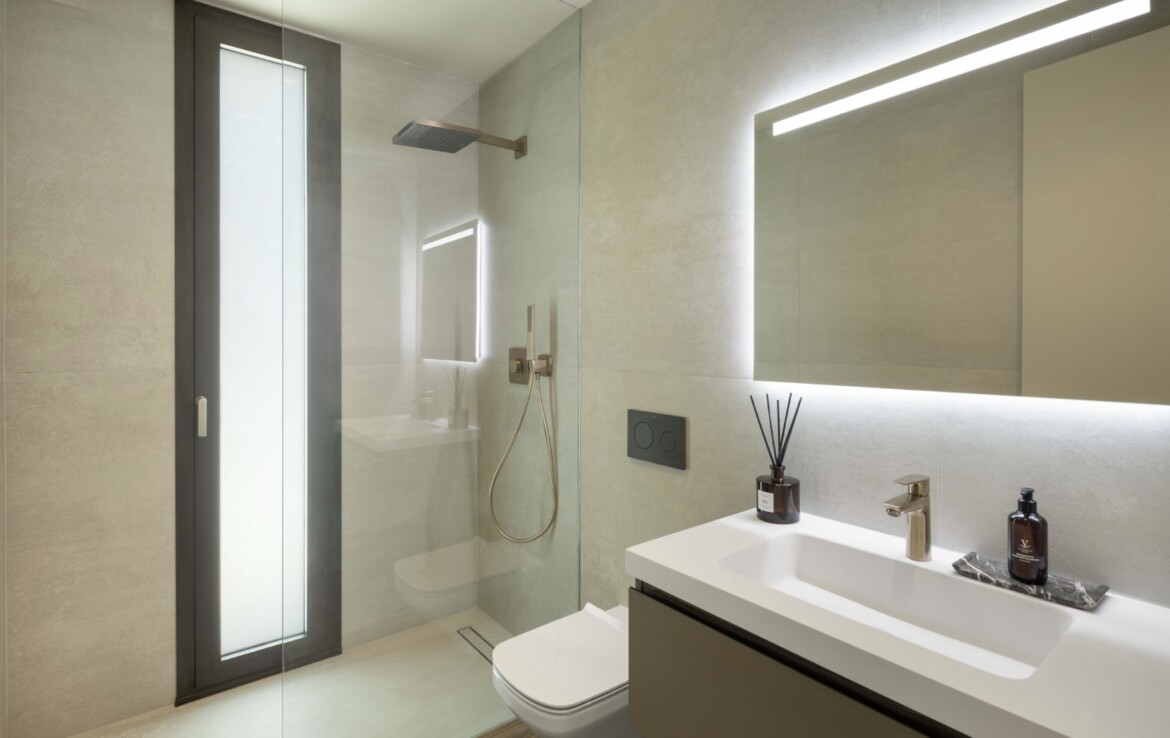El interior se define por su diseño moderno y su excepcional artesanía, con una escalera de hormigón pulido con barandilla de cristal laminado y sistemas de acristalamiento Q-Rail que realzan las terrazas. Los baños cuentan con elegantes duchas de efecto lluvia Hansgrohe, platos de ducha de porcelana integrados e inodoros suspendidos con cisterna oculta; todo ello diseñado para una estética limpia y contemporánea.