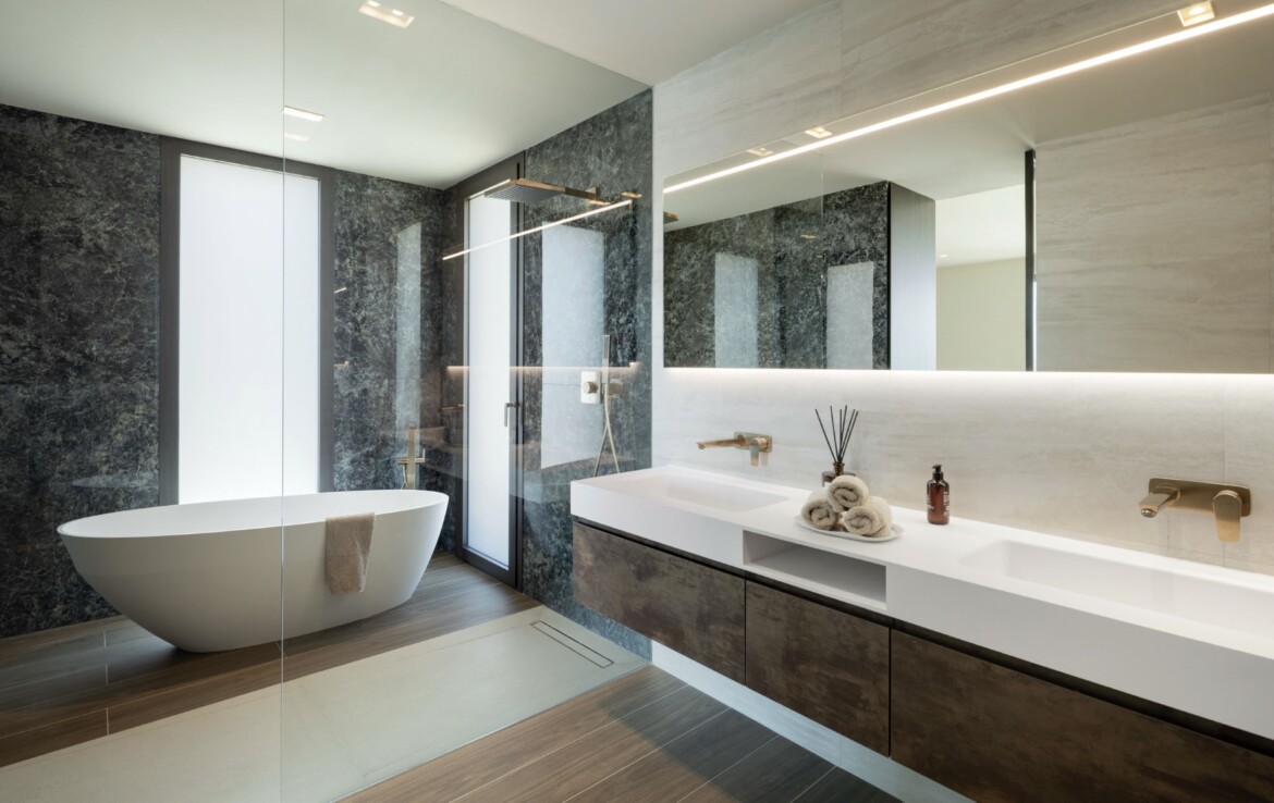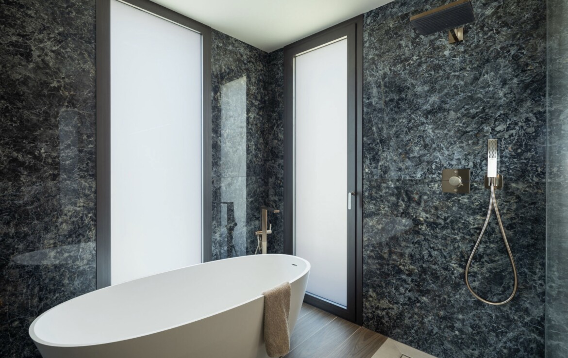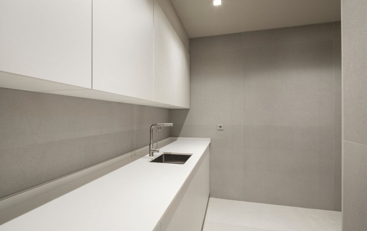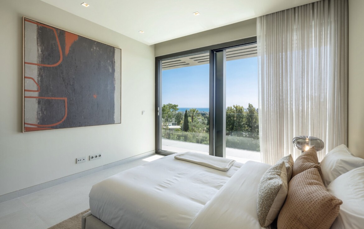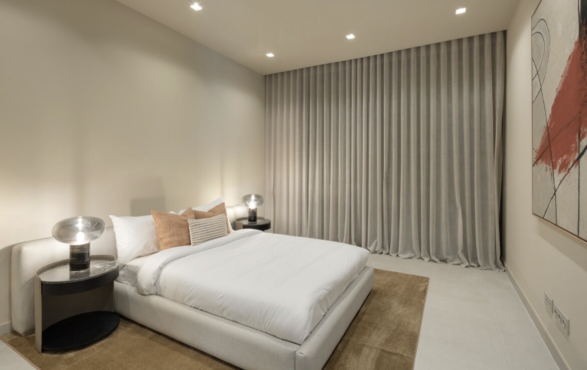 El interior se define por su diseño moderno y su excepcional artesanía, con una escalera de hormigón pulido con barandilla de cristal laminado y sistemas de acristalamiento Q-Rail que realzan las terrazas. Los baños cuentan con elegantes duchas de efecto lluvia Hansgrohe, platos de ducha de porcelana integrados e inodoros suspendidos con cisterna oculta; todo ello diseñado para una estética limpia y contemporánea.