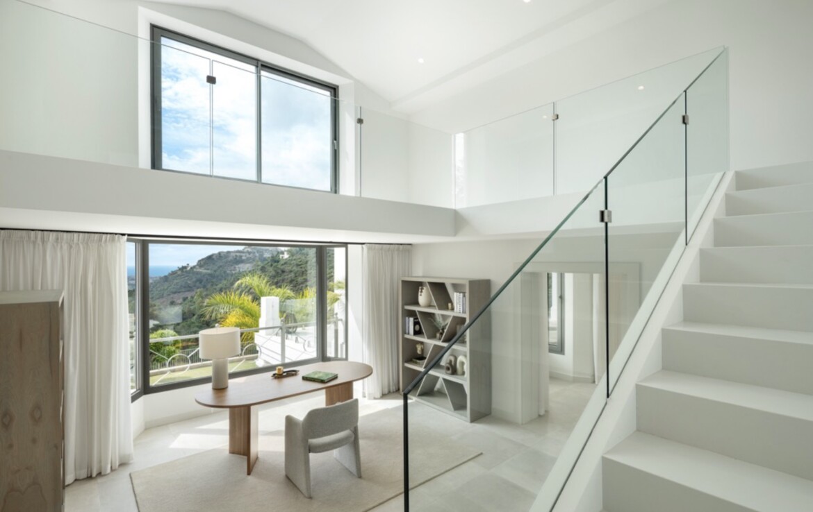 Al acceder a través de un elegante patio, se llega al vestíbulo de doble altura de la planta principal, que conduce a un amplio salón con grandes ventanales. Además, encontrará un comedor independiente, una espaciosa cocina con zona de desayuno y lavandería. La planta principal cuenta con dos dormitorios con baño privado, un despacho/biblioteca/dormitorio con vistas espectaculares, un aseo de invitados y una habitación independiente.