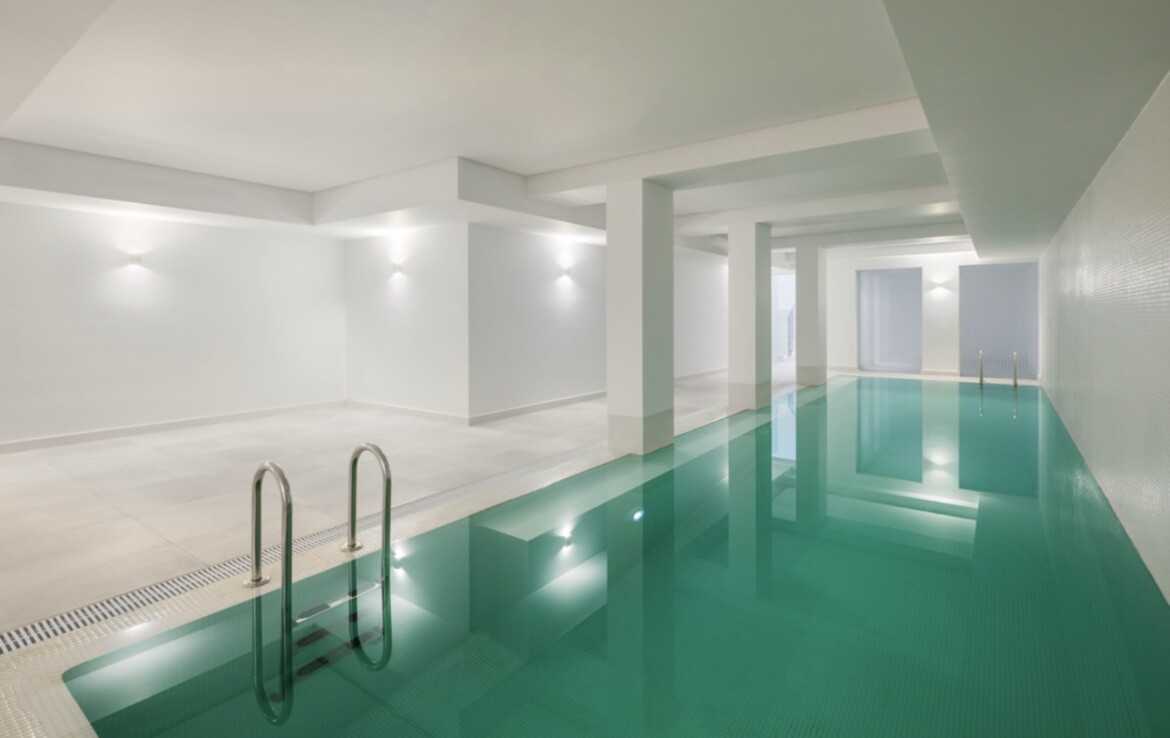 La planta baja, situada sobre el nivel del suelo y con acceso directo desde la piscina, se divide en dos alas. El ala este es un oasis de relajación con piscina climatizada interior, spa, gimnasio y zona de masajes y bienestar. El ala oeste está dedicada al ocio y el entretenimiento, con sala de cine, sala de juegos, bar, bodega y varios trasteros.